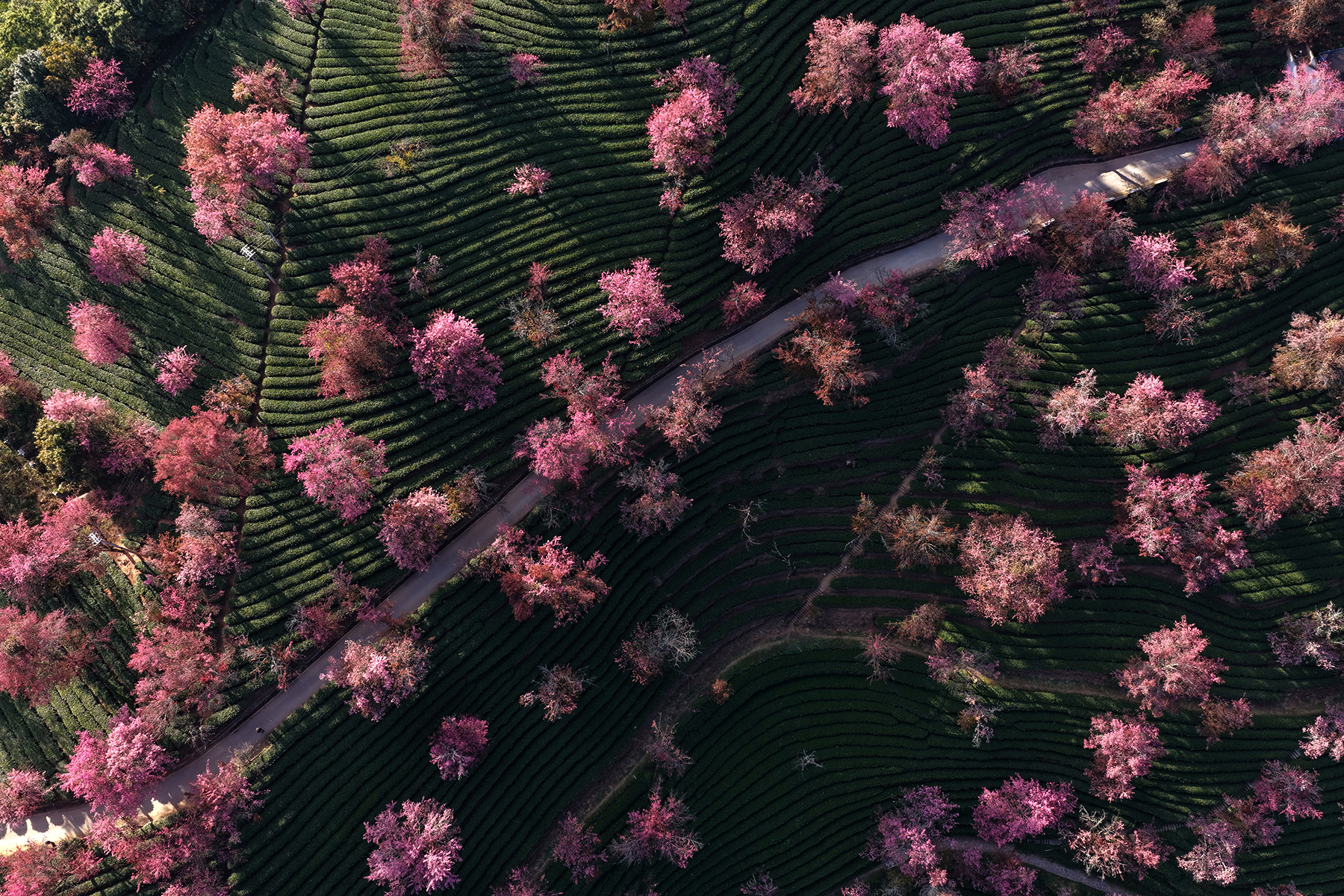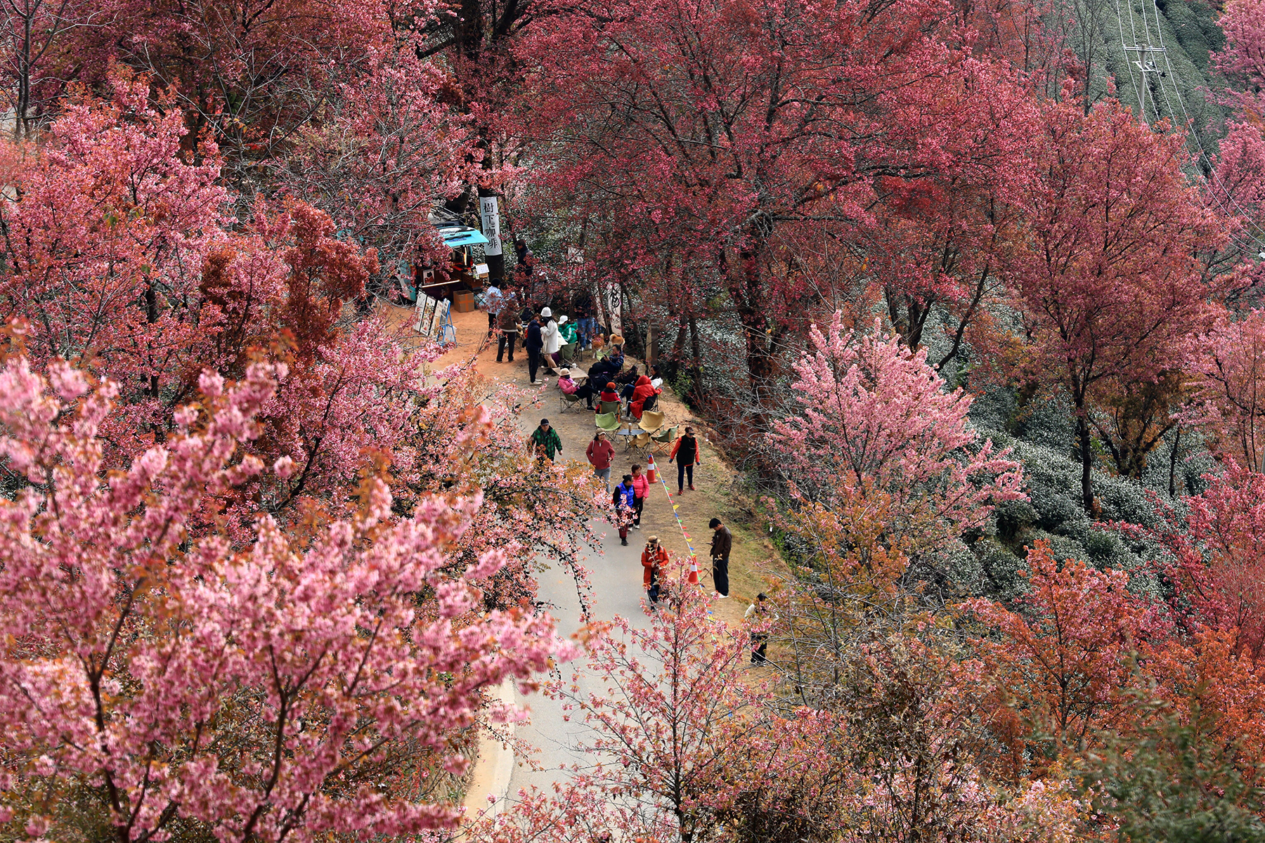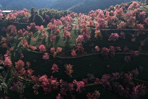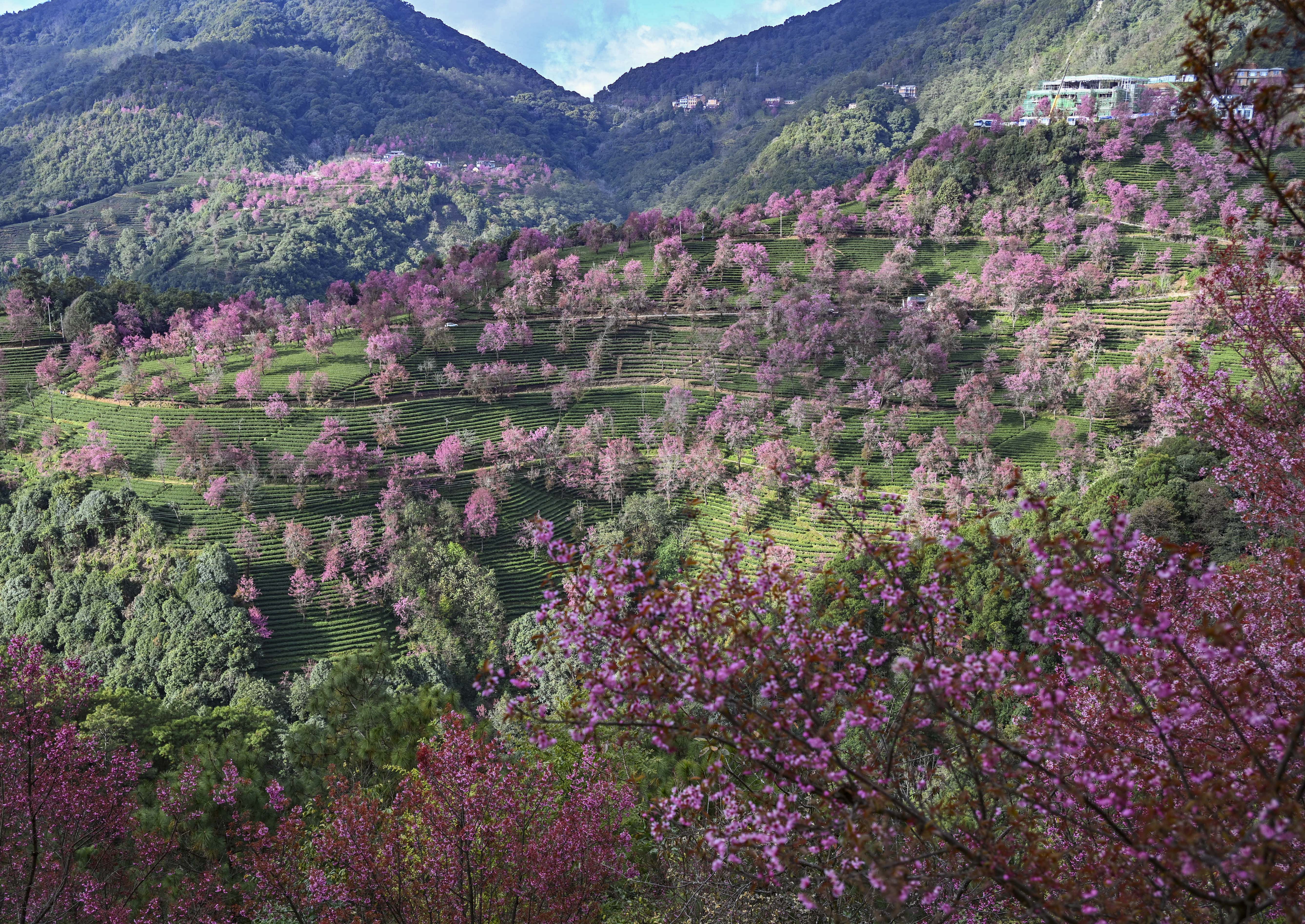 进入12月,云南省大理白族自治州南涧彝族自治县无量山樱花谷的冬樱花陆续绽放,与茶园、云海构成一幅美丽的山水画卷。