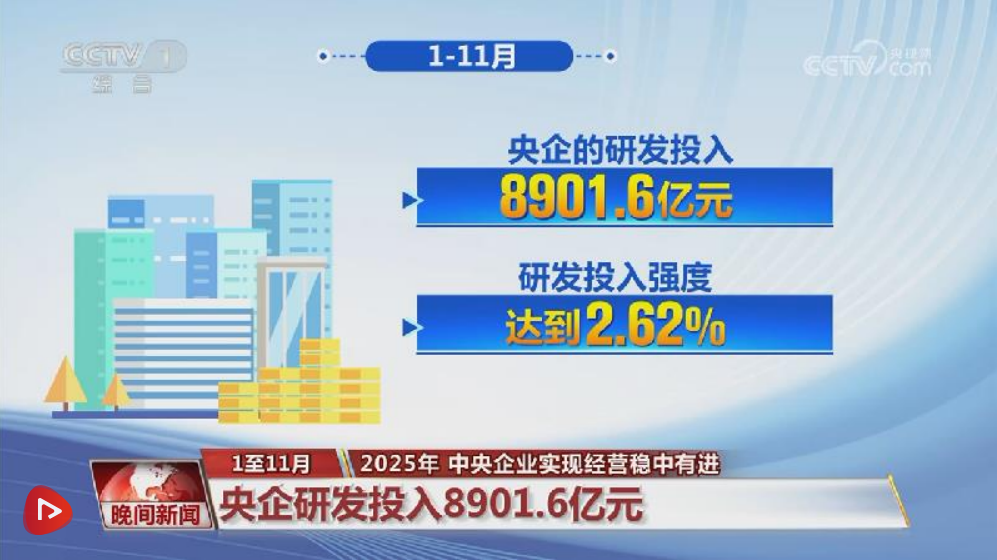 2025年以来,中央企业以更大力度强化自主创新,在国家创新体系中的作用更加凸显。1—11月,央企的研发投入8901.6亿元,研发投入强度达到2.62%。累计建设国家级研发平台474个,91个全国重点实验室实现重组入列。