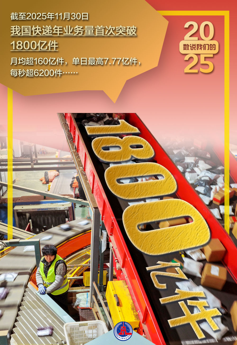 记者12月1日从国家邮政局获悉,国家邮政局监测数据显示,截至2025年11月30日,我国快递年业务量首次突破1800亿件。↓
