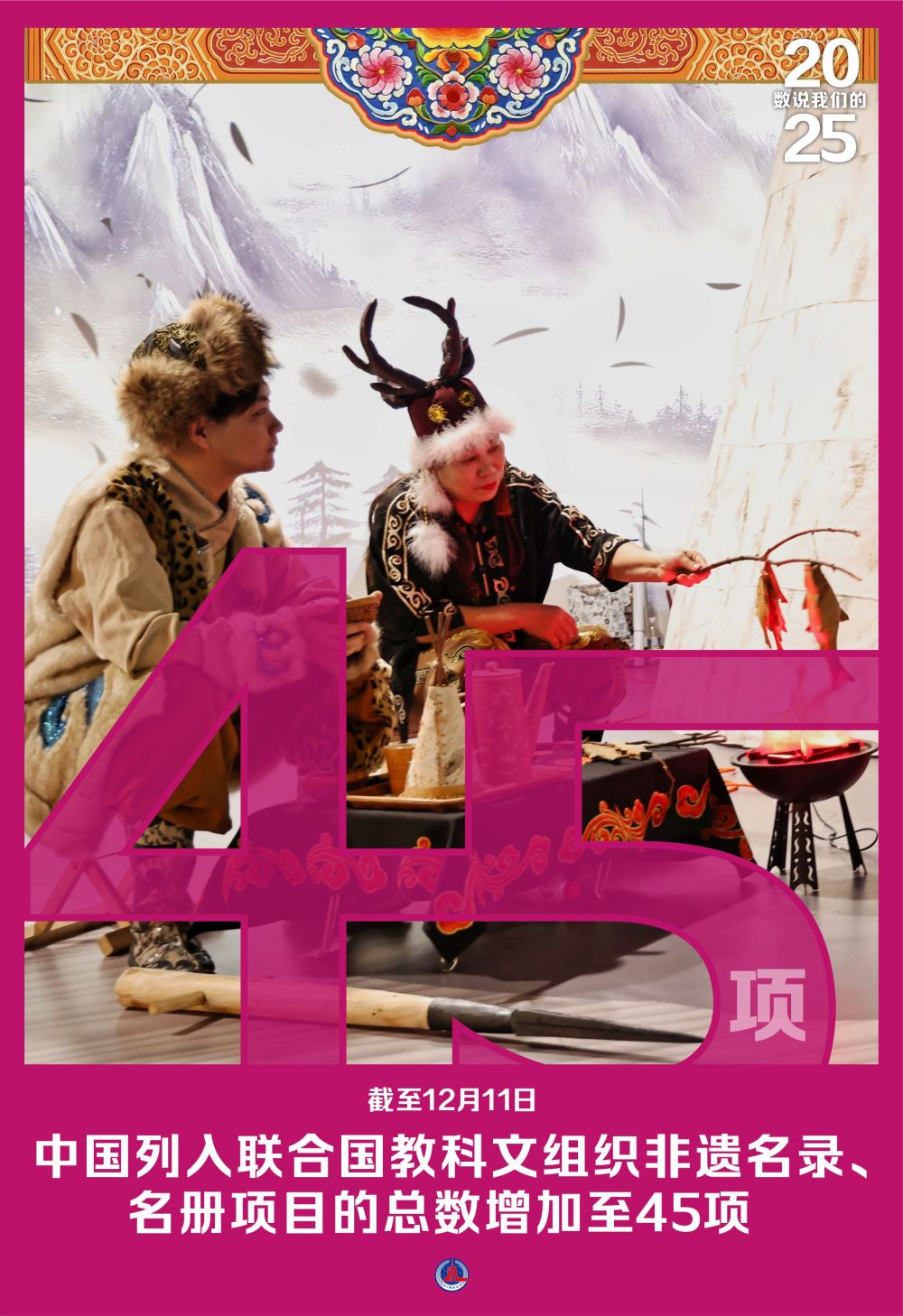 联合国教科文组织保护非物质文化遗产政府间委员会12月11日在新德里举行第20届常会,通过评审,决定将中国“赫哲族伊玛堪”从急需保护的非物质文化遗产名录转入人类非物质文化遗产代表作名录。 至此,中国列入联合国教科文组织非遗名录、名册项目的总数增加至45项。↓