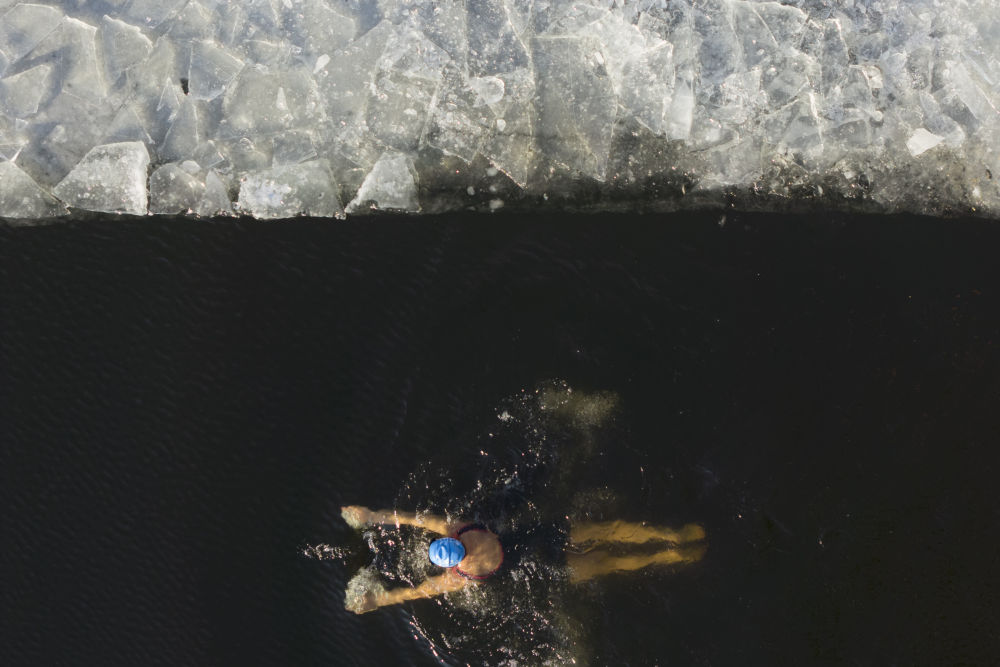 ↑2025年12月12日,冬泳爱好者在哈尔滨中东铁路公园冬泳场游泳(无人机照片)。