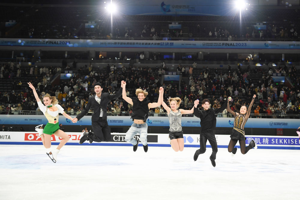 ↑2023年12月10日,格鲁吉亚组合梅特尔基纳/别鲁拉瓦、美国组合马尔克洛夫/内塞特、日本选手中田璃士和岛田麻央(从左至右)在2023-2024赛季国际滑联世界花样滑冰大奖赛总决赛表演滑结束后合影。