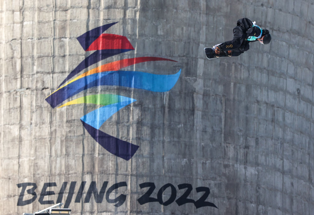↑2022年2月15日,中国选手苏翊鸣在北京2022年冬奥会单板滑雪男子大跳台决赛中。