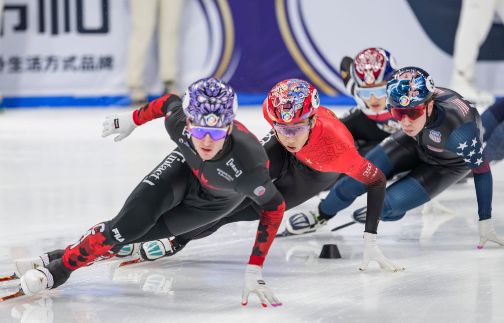 3月16日,中国队选手孙龙(左二)在2025年国际滑联世界短道速滑锦标赛男子5000米接力A组决赛中。