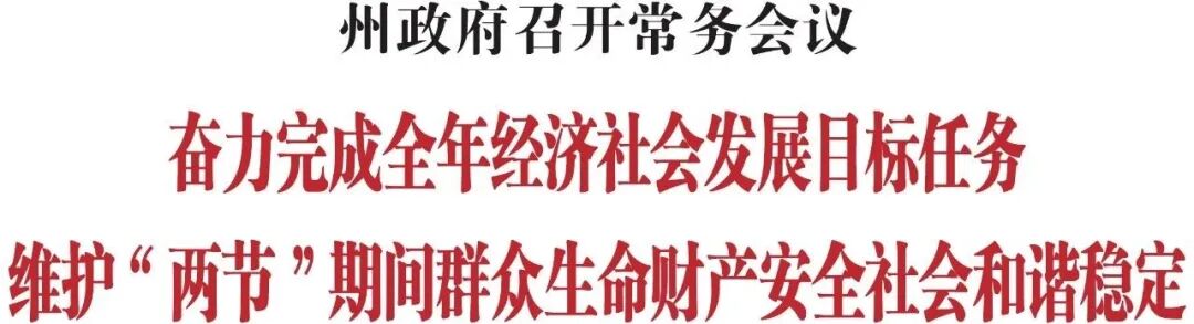 12月31日,州委副书记、州长洪庆主持召开十六届州人民政府第51次常务会议,传达学习国务院常务会议、省政府常务会议精神,听取全州经济运行、近期安全生产工作以及2025年粮食安全工作的汇报。 会议指出,要认真贯彻落实国务院常务会议精神,更高水平更高质量做好节能降碳工作,加快形成绿色生产生活方式。认真开展规范涉企行政执法专项行动,进一步厘清执法权责边界,使行政权力始终在法治轨道上运行。着力增强基层消防救援能力,坚决防范遏制重特大火灾事故发生。严厉打击涉烟违法活动,切实维护国家利益和消费者权益。