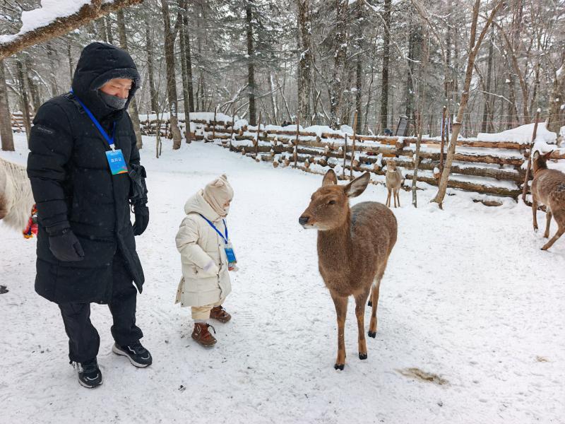 行至景区中心处的“粉雪部落”,浓郁的东北风情扑面而来。“智取威虎山”主题场景成了最热闹的打卡点,欢声笑语不断。鹿园里,孩子们轻轻抚摸驯鹿、喂食苔藓,体验着与森林精灵亲近的乐趣。“在南方从没见过真正的驯鹿,这种体验太难得了”,来自云南的段先生一边录制视频,一边准备向家人“炫耀”这份难得的美好。