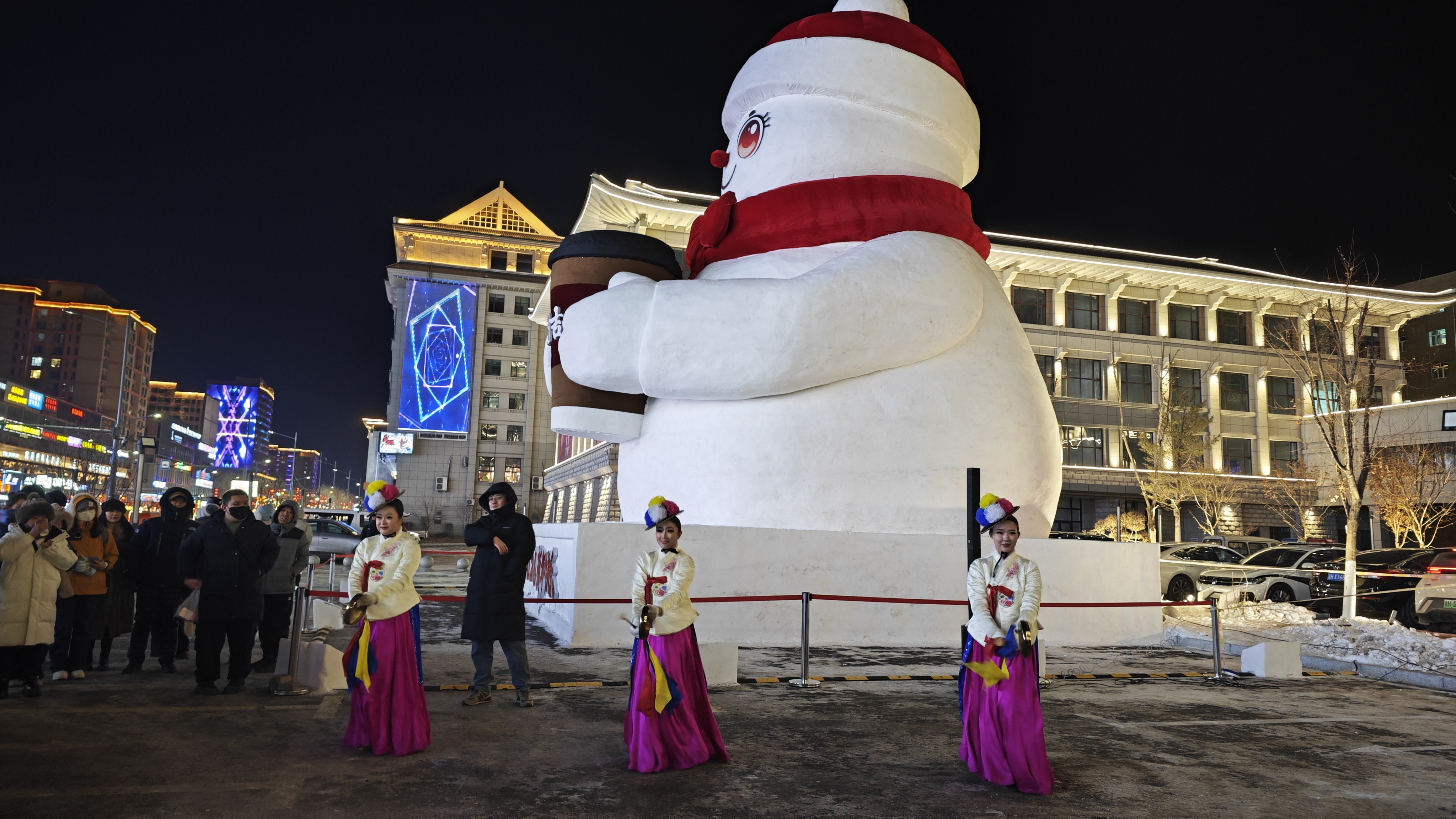 亮相仪式上,民族音乐悠扬婉转,袅袅曲声彰显国潮魅力,民俗舞步踏月凌风,裙裾翩跹卷起非遗古韵,以文艺展演增进文化认同感与获得感;现场免费发放印有“延吉”字样的热饮,既满足拍照打卡的“刚需”,又传递真诚热忱的“柔情”,尽显宠客之道。当仪式进入高潮阶段,灯光渐暗,众人齐数倒计时,网红雪人在AI声效中点亮华光,用赛博科技迎“新”启航。