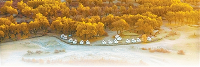 新疆于田县达里雅布依老村地处沙漠腹地,不通公路、没有通信信号和稳定供电。整村易地扶贫搬迁后,当地在老村附近发展沙漠探险等特种旅游,吸纳村民加入旅游合作社,拓宽增收渠道。图为老村附近的胡杨林带和新修的民宿。