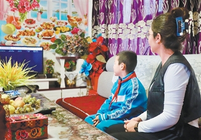 艾孜热提罕·木沙和儿子在新家一起看电视。
