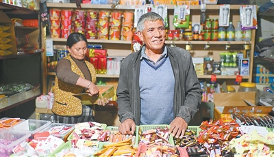 村民艾尼瓦尔·买提斯地克(右)和妻子一起在达里雅布依老村经营一家小商店,为到访的游客提供便利。