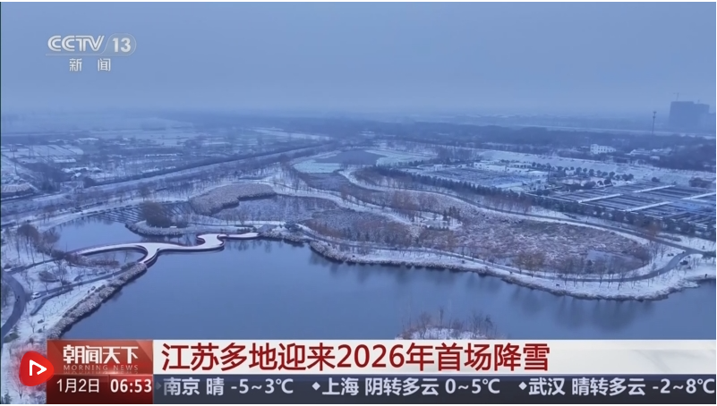 央视网消息:1月1日早晨,江苏宿迁、淮安等地迎来了2026年的第一场雪。皑皑白雪为城市披上银装,整座城市在白雪的映衬下显得更加静谧与浪漫。