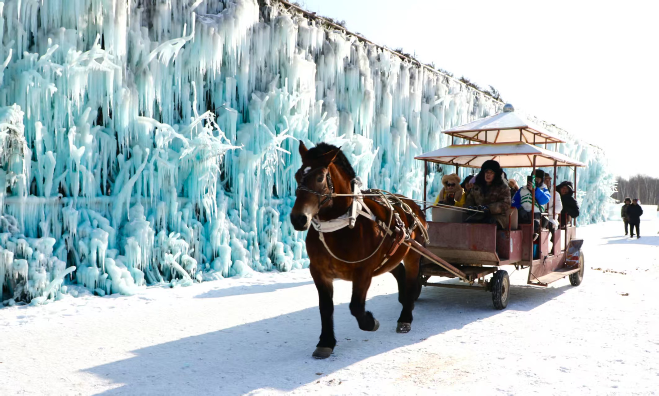 循着欢腾的人声步入园区,两个憨态可掬的圆润雪人首先映入眼帘——红围巾在素白天地间格外醒目,暖暖的笑容瞬间消融了北国的寒意。抬首远望,巨大的冰川瀑布赫然垂悬,宛如时间在此静止:流水凝脂,冰凌垂珠,在冬日阳光下流转着晶莹剔透的光晕,将冰雪的静谧之美推向极致。