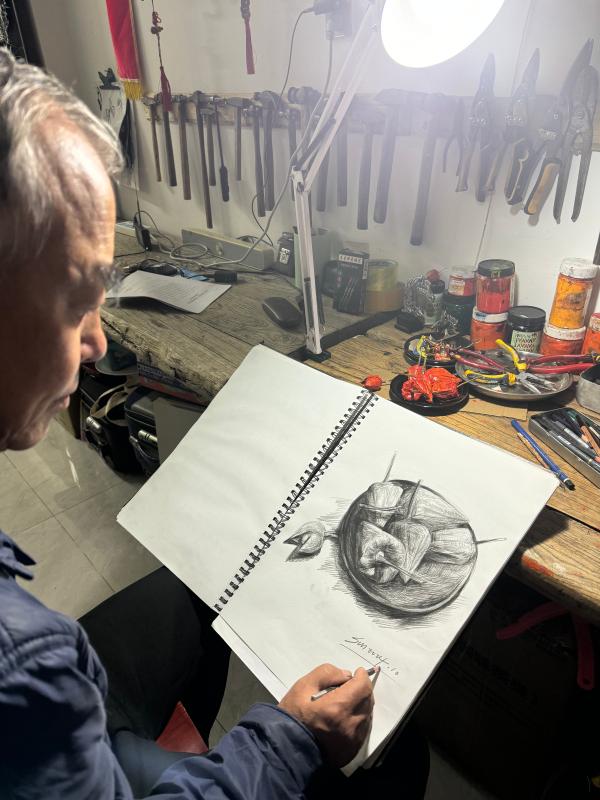 走进大师工作坊,墙上《火辣辣的日子》圆雕作品令人瞩目:形态各异的辣椒色泽古朴、纹路清晰,无任何焊点和胶水,全靠传统工艺咬合而成,铁的韧性与艺术美感完美融合。“创作既要源于生活,更要融入时代。”隋进才告诉记者,这件作品采用0.4毫米鱼鳞铁锻制,通过阴阳锻造工艺让画面层次分明,既保留传统精髓,又融入现代审美。
