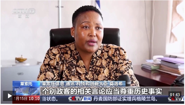 莱索托信息、通讯、科技和创新大臣 莫洛希:莱索托认为,个别政客的相关言论应当尊重历史事实,尊重国际关系的基本准则。莱索托在台湾问题上的立场一贯而明确,我们坚定奉行一个中国原则,承认世界上只有一个中国,台湾是中国的一部分。