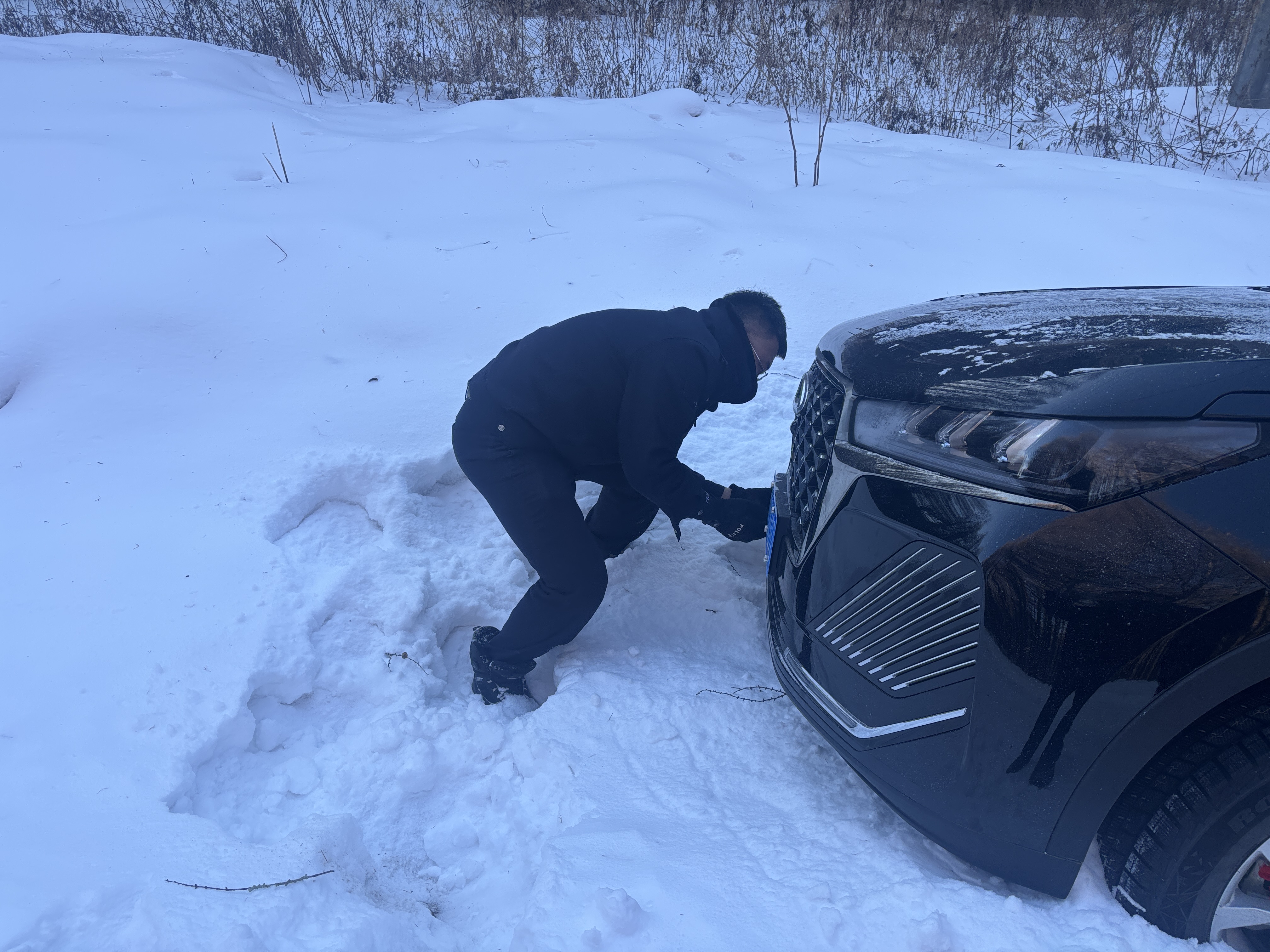 1月18日9时许,沙金沟森林派出所在巡逻过程中,发现一辆私家车在途经金沟岭林场至地阴沟林场沿线时,由于车速过快且路面结冰,存在浮雪导致车辆打滑,车辆不慎冲入路边排水渠中,车身倾斜过半,车轮深陷排水渠积雪中,无法自行脱困。发现这一情况后,民警一边安抚被困群众的情绪,详细询问人员情况及车辆型号,一边帮助其寻找车辆拖车钩所在位置并安置拖车绳。经现场勘查,被困车辆右侧两轮完全陷入排水渠,底盘卡于沟沿,排水渠内积雪覆盖深厚,由于现场没有工具,民警徒手奋力刨除车轮周边的积雪,清理出作业空间,同时引导车主配合调整方向盘、控制油门,开始使用警车对被困车辆实施救援拖拽。经过30余分钟的紧张施救,被困车辆成功被牵引至安全路面,民警确认车辆无机械故障后叮嘱车主雪天行车务必降低车速,获救车主握住民警的手连连感谢:“多亏了你们,这荒郊野外的也没有手机信号,要不我真不知道该怎么办好了!”