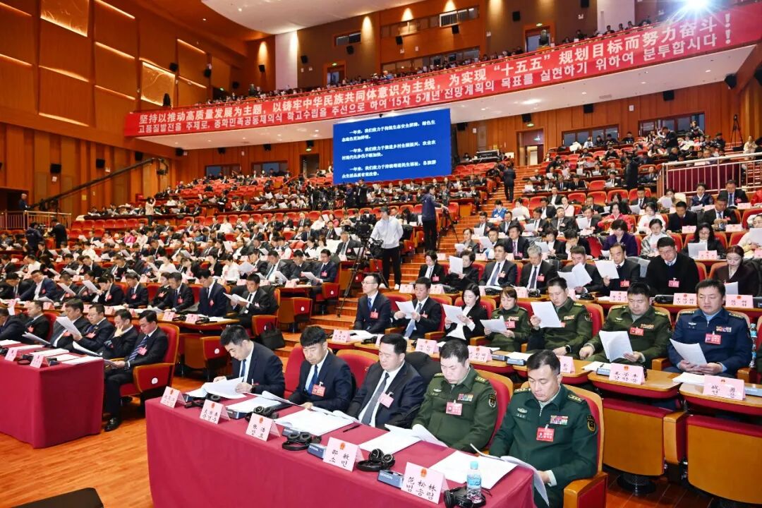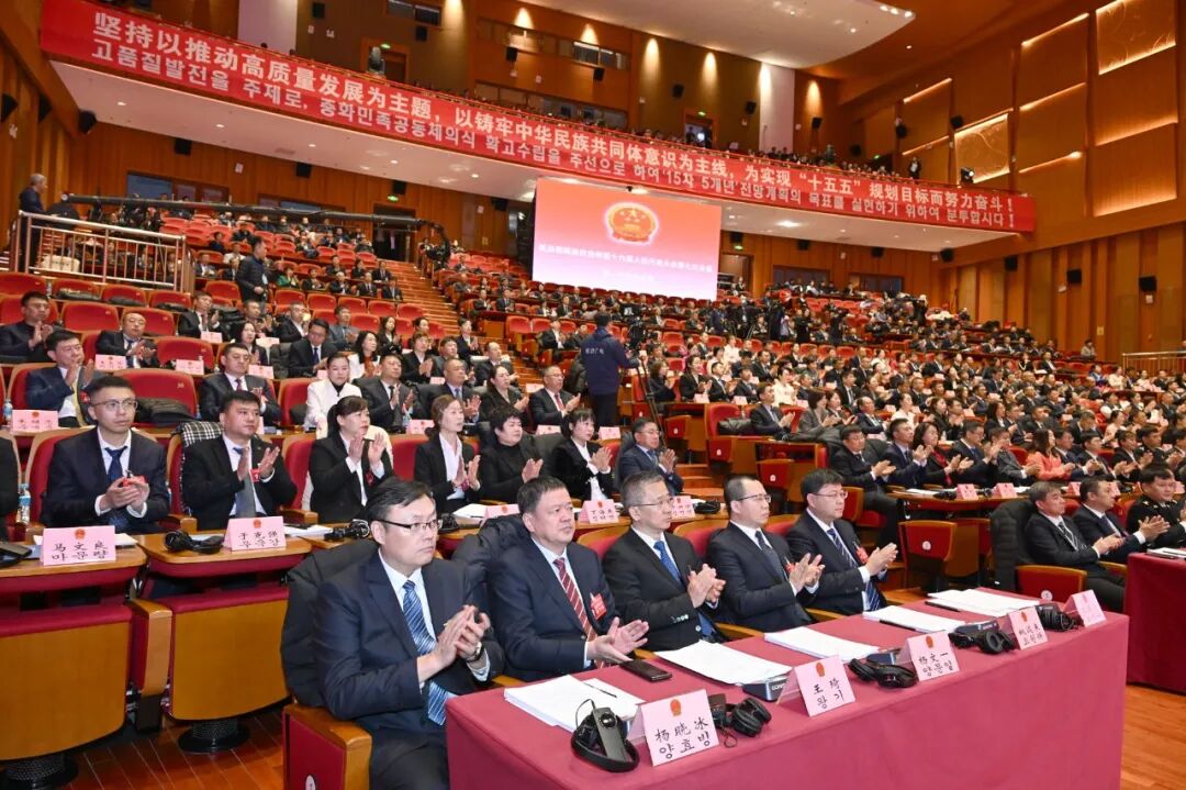 会场内气氛庄重热烈,主席台正中,国徽高悬,在十面鲜艳红旗的簇拥下熠熠生辉。二楼眺台上,“坚持以推动高质量发展为主题,以铸牢中华民族共同体意识为主线,为实现‘十五五’规划目标而努力奋斗!”的标语鲜明夺目,字字铿锵,激荡着奋进新征程的信念与豪情。