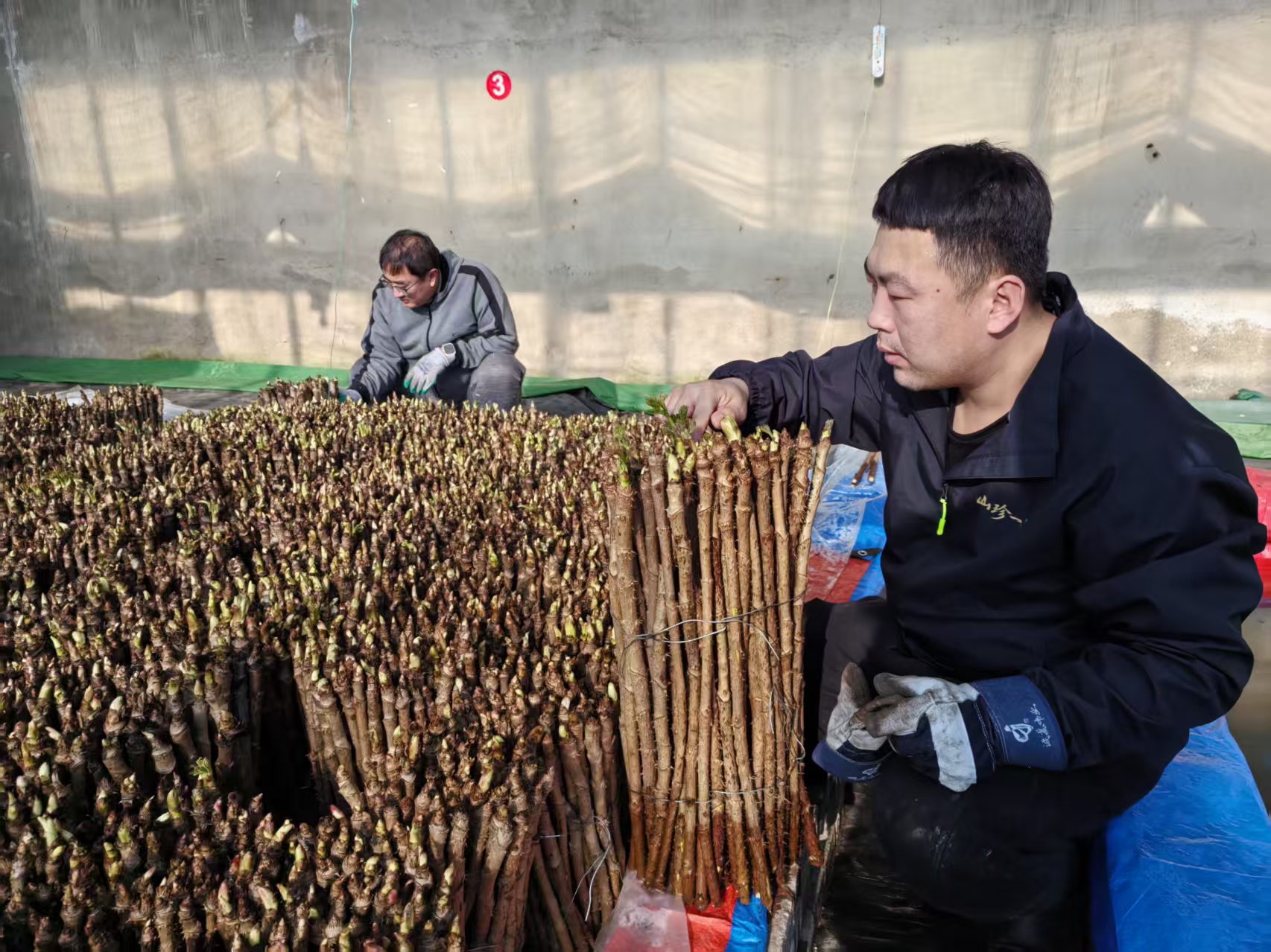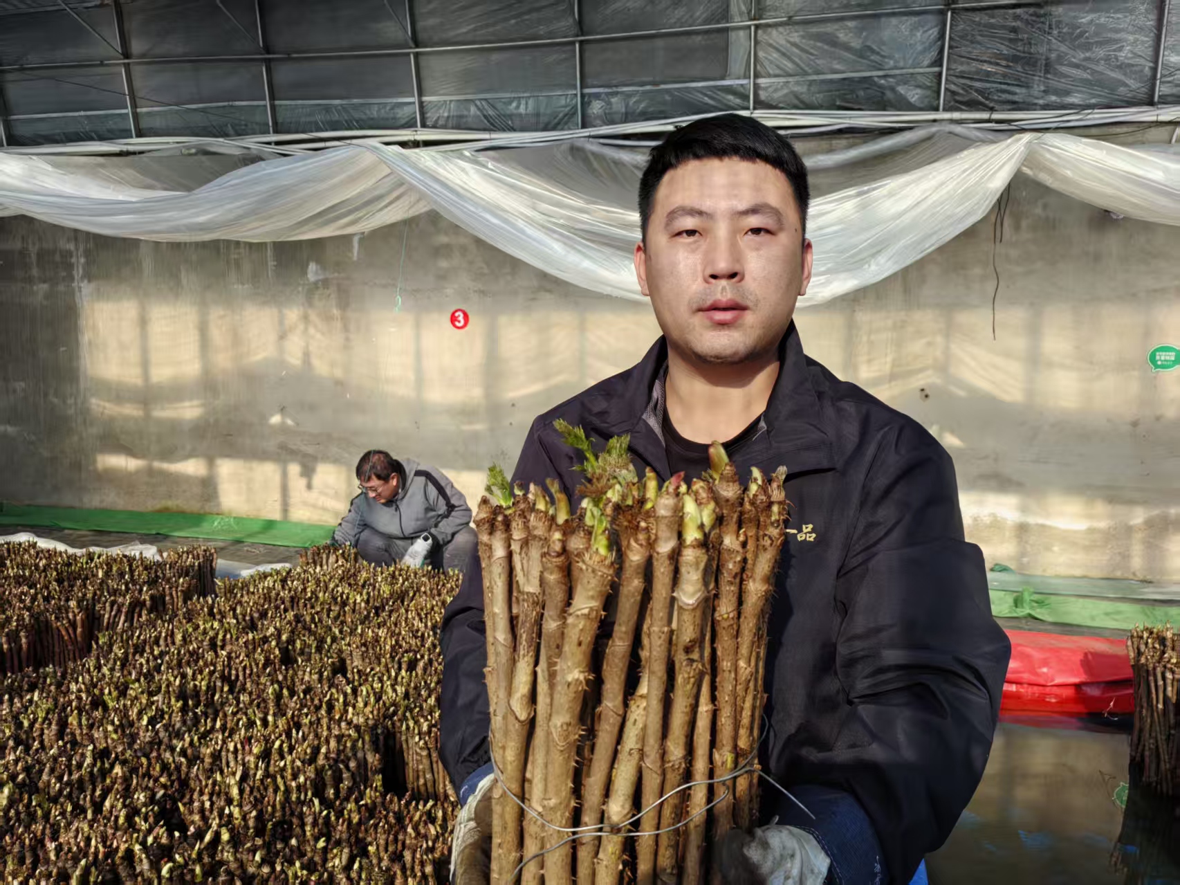 “这是刺嫩芽,学名刺龙芽,被誉为‘山菜之王’,不仅口感脆嫩清香,还富含皂甙、黄酮等营养成分,营养价值比普通蔬菜高出许多。”31岁的基地负责人于泳航戴着厚实的橡胶手套,小心翼翼地拨开一簇刺嫩芽芽胞向记者介绍。“以前我在汪清县罗子沟镇养藏香猪,后来转行到一家企业上班,边工作边琢磨自主创业,就瞄准了绿色产业。”于泳航擦了擦额头的汗珠,眼里闪着亮光,“我养猪那会儿,春天经常上山采刺嫩芽吃,咱东北人冬天就馋这口山野菜,但野生的刺嫩芽只有春天才有,反季种植肯定有市场。”去年8月,于泳航联合3名志同道合的年轻人,专程前往沈阳新民市的刺嫩芽种植企业学习技术,从枝条选种、水质调控到温度管理,他们把每个细节都记在笔记本上、印到脑海里。“反季水培看着简单,其实学问大着呢,水温要控制在8-12℃,室温得稳定在18-22℃,还要三天一通风,五天一换水。”于泳航指着水培池介绍,去年11月从辽宁采购来10万杆纯野生刺嫩芽杆,经过分级筛选后,于12月11日正式入池培育,“这些刺嫩芽杆都是精挑细选的,每根长度60厘米左右,芽胞完整饱满,只有这样才能长出好嫩芽。”