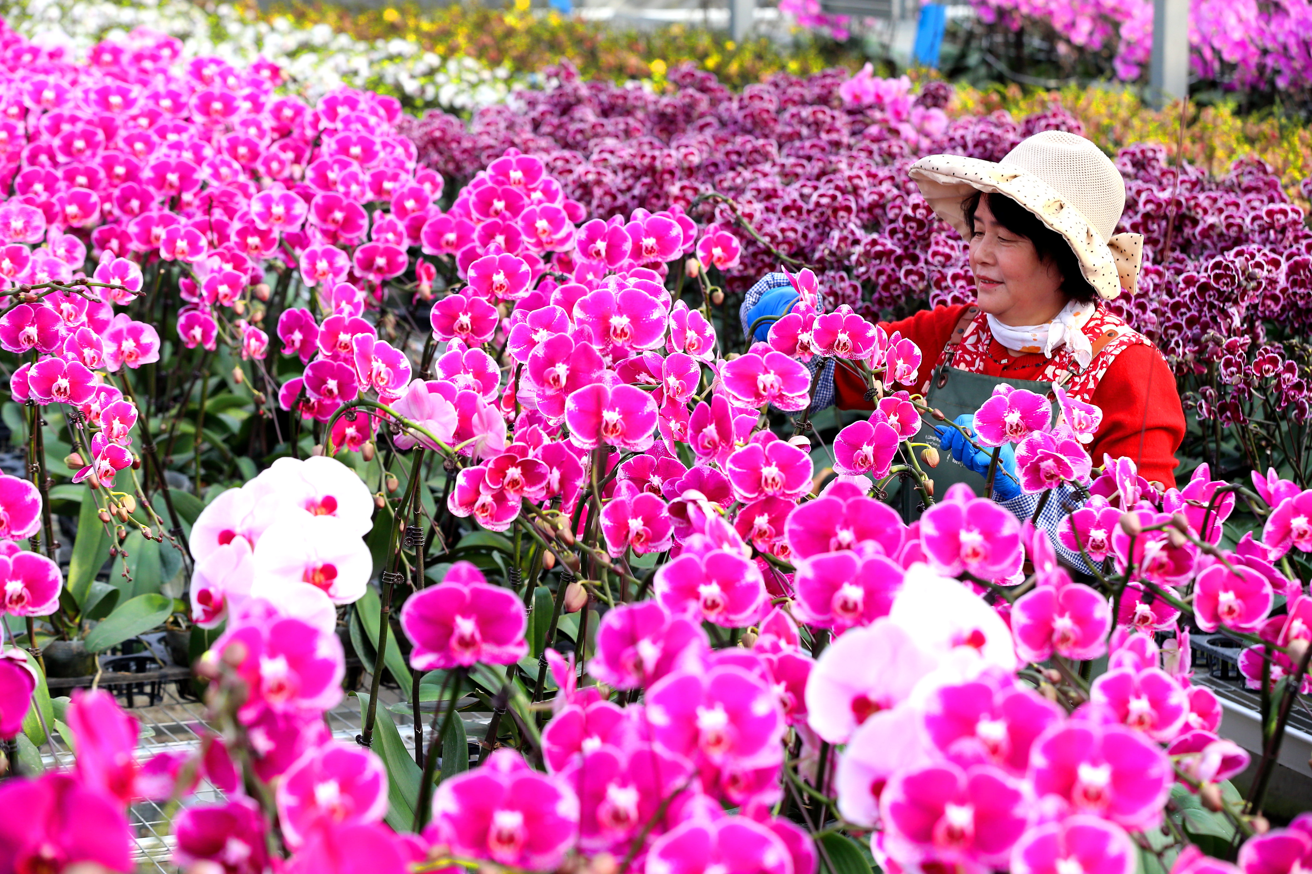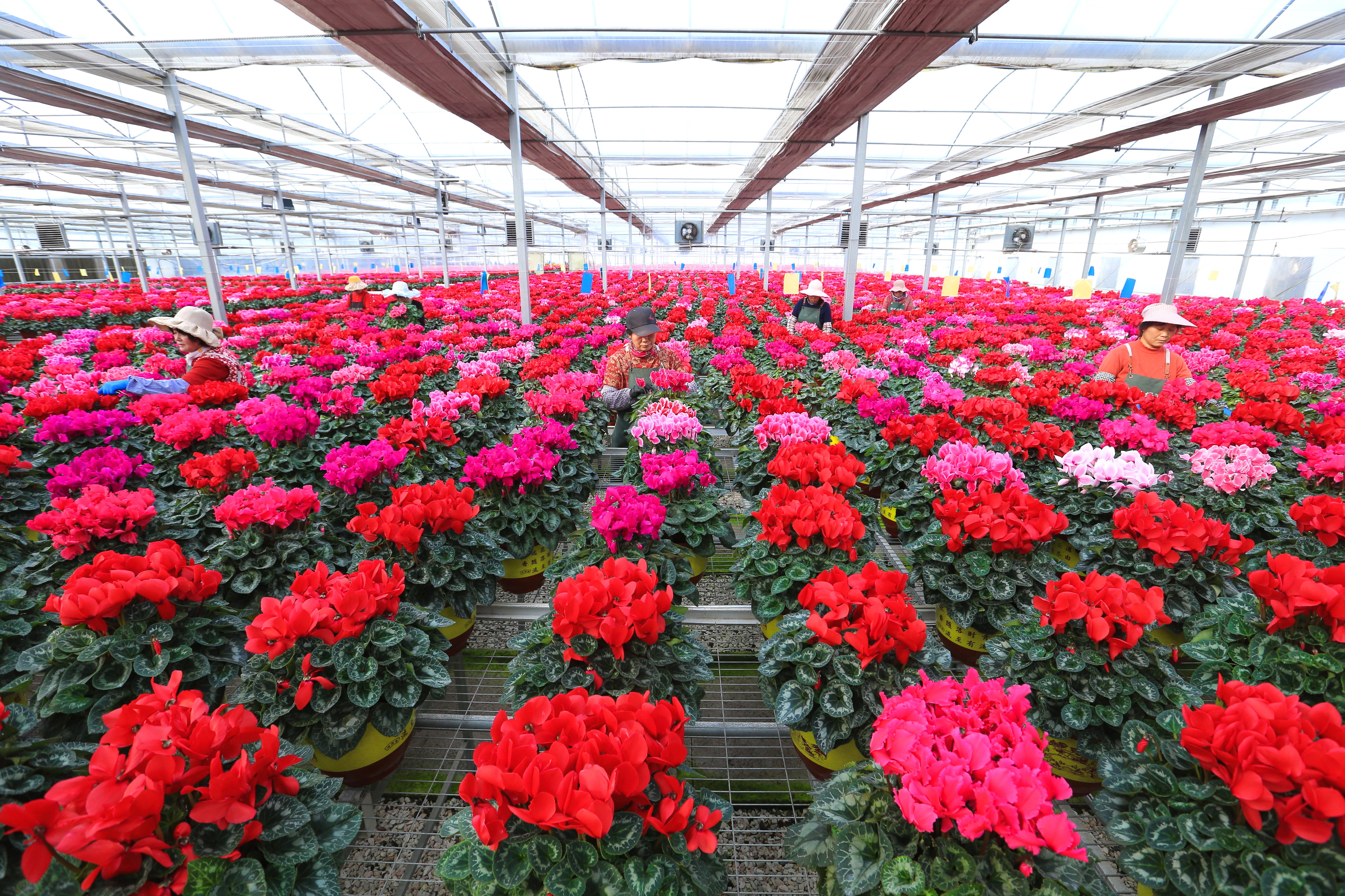 春节临近,山东省青岛市即墨区灵山花卉文化产业园的年宵花迎来生产和销售旺季,花卉大棚内的蝴蝶兰、长寿花、仙客来等竞相绽放,花农们按照订单外运各类花卉,供应节日市场。