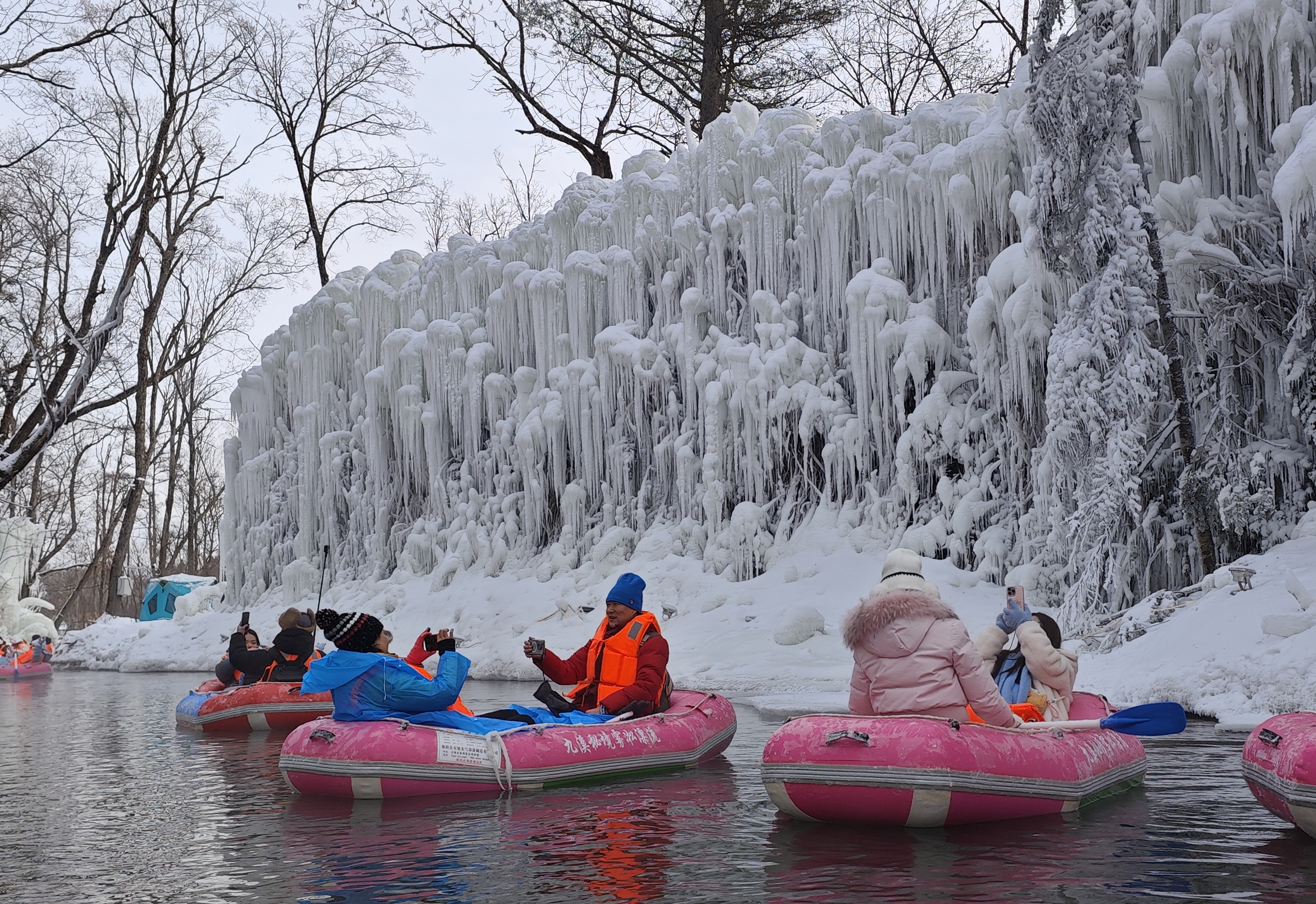清晨的长白山九溪听泉景区漂流区,溪流潺潺,氤氲的水汽在极寒中凝华,形成耀眼的冰晶绽放于枝头。阳光之下,整个景区光影斑斓,宛若仙境。这里是本次嘉年华的核心体验项目——矿泉雾凇漂流。不同于夏季激流的刺激,冬季漂流更添一份静谧与梦幻。游客们身着专业防水服,乘着皮艇,在澄澈如碧玉的矿泉河水中缓缓而下,或静静欣赏,或兴奋地举起手机、相机,记录这“人在画中游”的绝美瞬间。