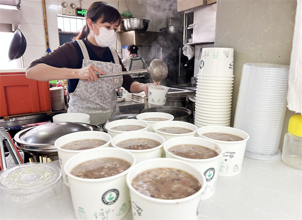 一碗热粥,不仅是舌尖上的美味,更承载着岁月的记忆与情感。市民陈先生特意带着孩子前来品粥,他感慨地说:“腊八喝粥是老传统了,带孩子来感受这份民俗文化,希望他们记住这些美好。”店内一位美团骑手也忙个不停,他告诉记者,从早上6点多便开始接单,一早就接了十几单,每单都少不了腊八粥,自己也在忙碌中感受到了浓浓的节日氛围。走访中,多家粥铺的腊八粥均成“人气单品”,香甜气息在街巷飘散,让节日氛围愈发浓厚。