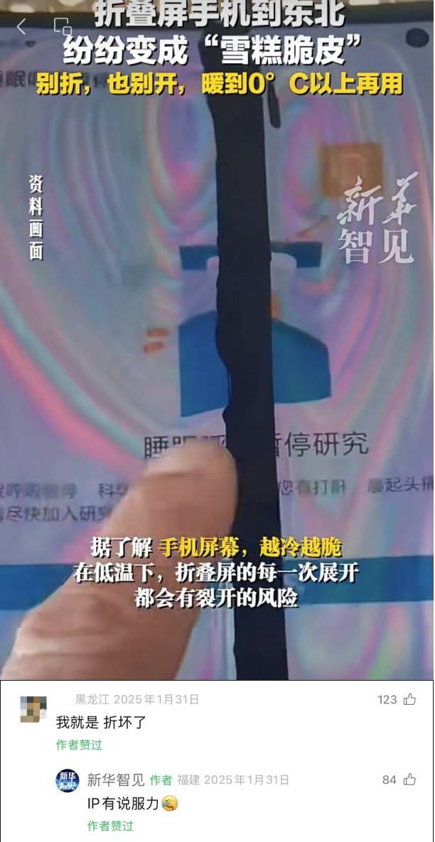 有网友在社交平台发帖称,自己带着折叠屏手机到寒冷地区游玩,结果打开手机时发现,屏幕被冻坏或冻裂了。也有网友表示,自己的折叠屏手机在东北使用,没出现问题。