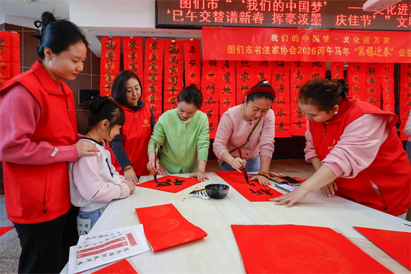 1月29日,图们市委宣传部(市文广旅局)、市文联、市新时代文明实践宣教中心、市书法家协会,在图们市新时代文明实践中心联合开展了“‘我们的中国梦’——文化进万家之‘巳午交替谱新春 挥毫泼墨庆佳节’”文明实践活动。