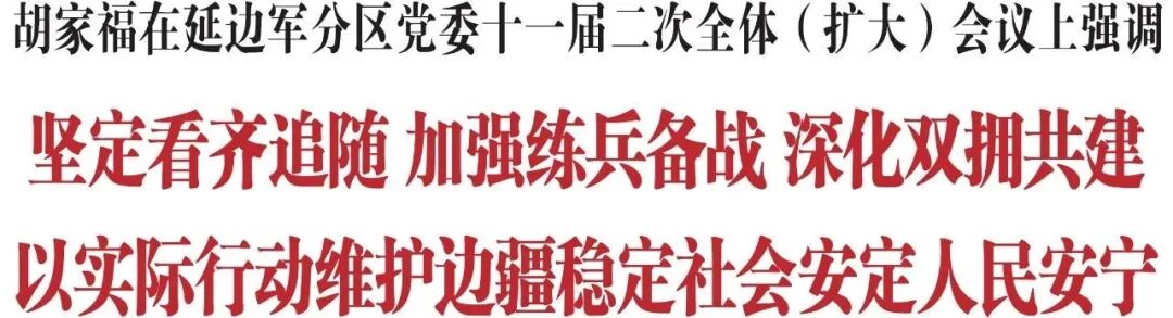 胡家福强调,今年是中国共产党成立105周年、“十五五”开局之年,也是打好实现建军一百年奋斗目标攻坚战的关键之年。军分区各级要坚决贯彻新时代军事战略方针,以更高标准、更实举措推进政治建军、抓好练兵备战、深化军地融合,不断提升我州国防动员和后备力量建设质效。一要深入推进政治建军,筑牢看齐追随的思想根基。坚持把政治建设贯穿军分区工作各领域全过程,及时跟进学习习近平总书记关于国防和军队建设最新重要论述,贯通推进整顿思想、整顿用人、整顿组织、整顿作风、整顿纪律,从根本上、从源头上夯实党指挥枪的政治基础,确保任何时候任何情况下都坚决听从党中央、中央军委和习主席指挥。二要全神贯注练兵备战,扎实做好援战保战准备。时刻保持战略清醒、使命清醒和责任清醒,与时俱进更新战争思维和作战理念,持续深化党政军警民合力强边固防协作,扎实做好巡逻执勤、联防演练等重点任务,更好地服务备战、支撑打赢。三要大力弘扬优良传统,巩固坚如磐石的军政军民团结。各级党委、政府要把关心支持国防和军队建设当作分内之事、应尽之责,主动靠前办好事关备战打仗的大事要事,千方百计办好服务驻军发展的急事难事,用心用情办好暖兵心稳军心的好事实事,切实做到“前方无畏、后方无忧”。军分区各级要牢固树立“一盘棋”思想,立足地方所需、群众所盼、部队所能,带领驻延部队热爱延边、扎根延边、奉献延边,在稳边固防、抢险救灾、应急处突等急难险重任务上冲锋在前、再立新功,为推动延边高质量发展、可持续振兴贡献更大力量。