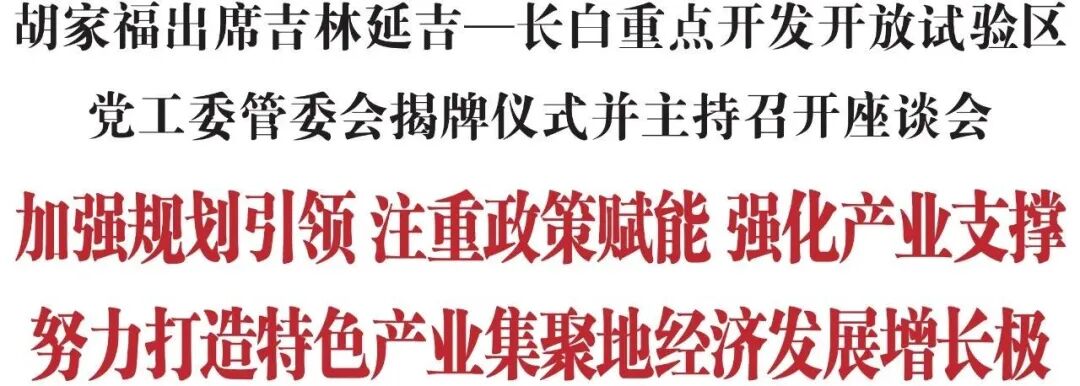 2月11日,吉林延吉—长白重点开发开放试验区党工委、管委会揭牌仪式在延吉举行。省委常委、州委书记胡家福出席揭牌仪式。他强调,要深入贯彻习近平总书记在听取吉林省委省政府工作汇报时的重要讲话精神,按照中央、省委经济工作会议的部署要求,加强规划引领,注重政策赋能,强化产业支撑,努力打造特色产业集聚地、经济发展增长极,为加快推动延边跨越赶超提供有力支撑。