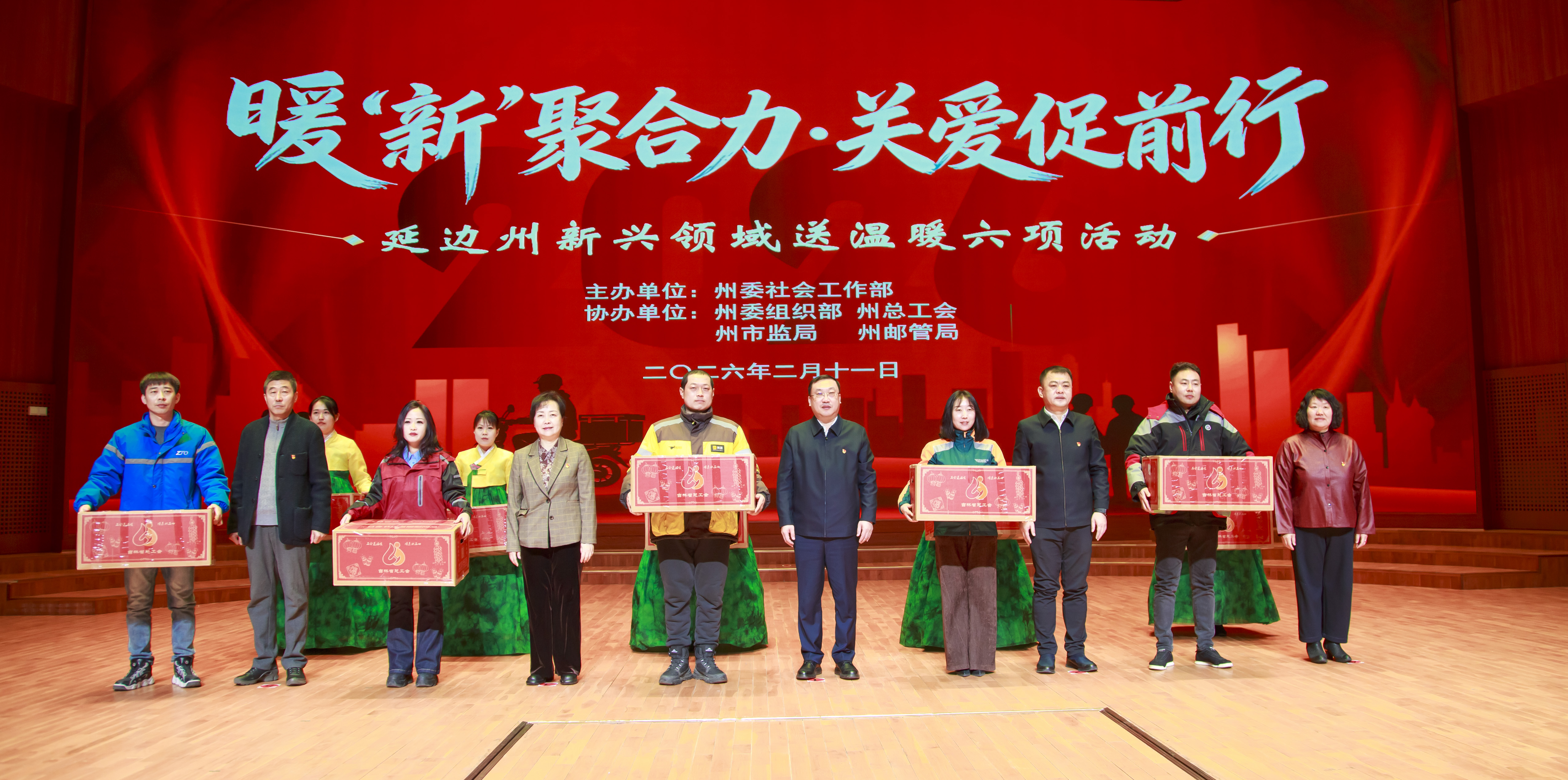 2月11日,州委社会工作部在延边工人文化宫举行“暖‘新’聚合力·关爱促前行”延边州新兴领域送温暖六项活动启动仪式。州委常委、组织部部长王朝辉出席仪式并为新就业群体代表发放暖心礼包。