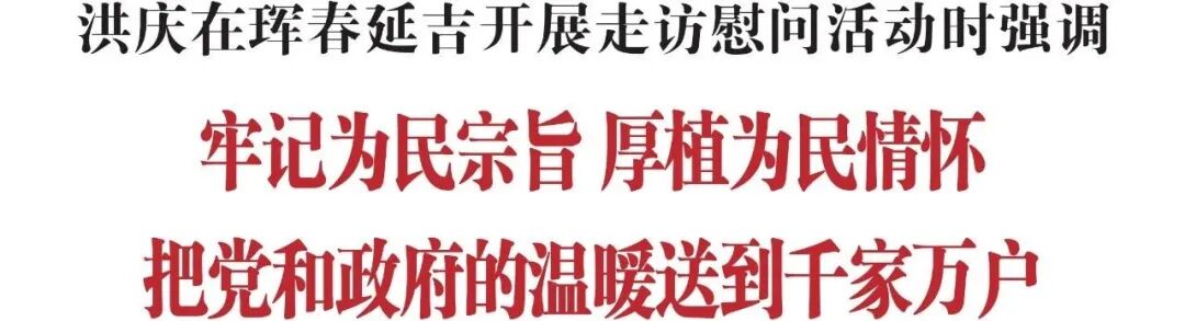 在新春佳节即将到来之际,州委副书记、州长洪庆先后到珲春市、延吉市走访慰问特困残疾人、特困劳模、城市低保户、困难党员、优抚对象及州级老同志,代表州委、州政府向他们送上节日问候和新春祝福。