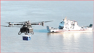 无人机在浙江宁波市象山石浦渔人码头配送鲜活海产及快递包裹。