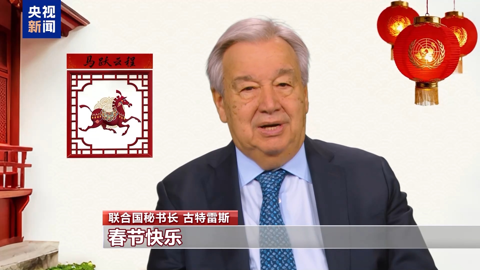 联合国秘书长 古特雷斯:春节快乐。值此迎接马年之际,愿骏马精神给你们带来健康、幸福和繁荣。唯有齐心协力,才能建设一个更安全、更包容的未来。让我们继续共同致力于人人享有和平、尊严和可持续发展的承诺。感谢中国和中国人民对多边主义和全球团结事业的大力支持。