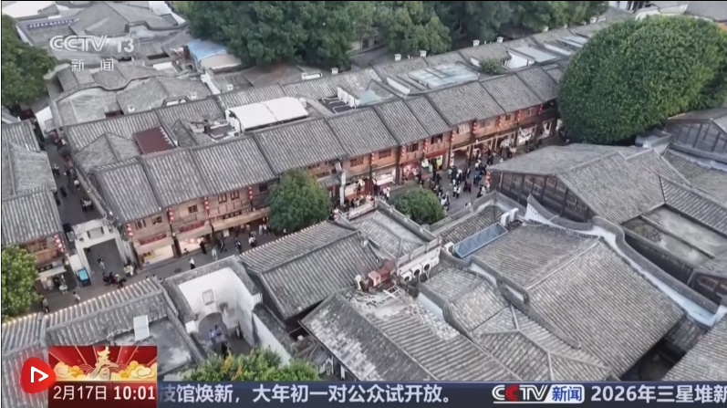 这里是福建福州,春节期间,三坊七巷迎来客流高峰。三坊七巷是我国现存规模较大、保护较为完整的历史文化街区,也是古代福州地区城市街巷和建筑文化的缩影。这里以南后街为中轴,西边有三座坊,东边有七条巷,形成了坊中有巷、巷巷相通的棋盘状格局,这里的年味儿藏在古厝群落里,一砖一瓦都镌刻着岁月的故事。