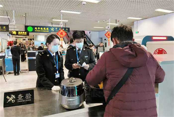 23时30分许,旅客陆续走进入境大厅,浓浓的年味儿扑面而来!大红的灯笼高高挂起,大屏幕上正在播放着热闹的春节联欢晚会,在一路“福”字的映衬下,旅客有序通过卫生检疫岗、申报岗、行李物品查验岗等。在携带物品合规的情况下,“无感通关”的便捷,使每一名旅客只需不到1分钟,即可顺利通关。