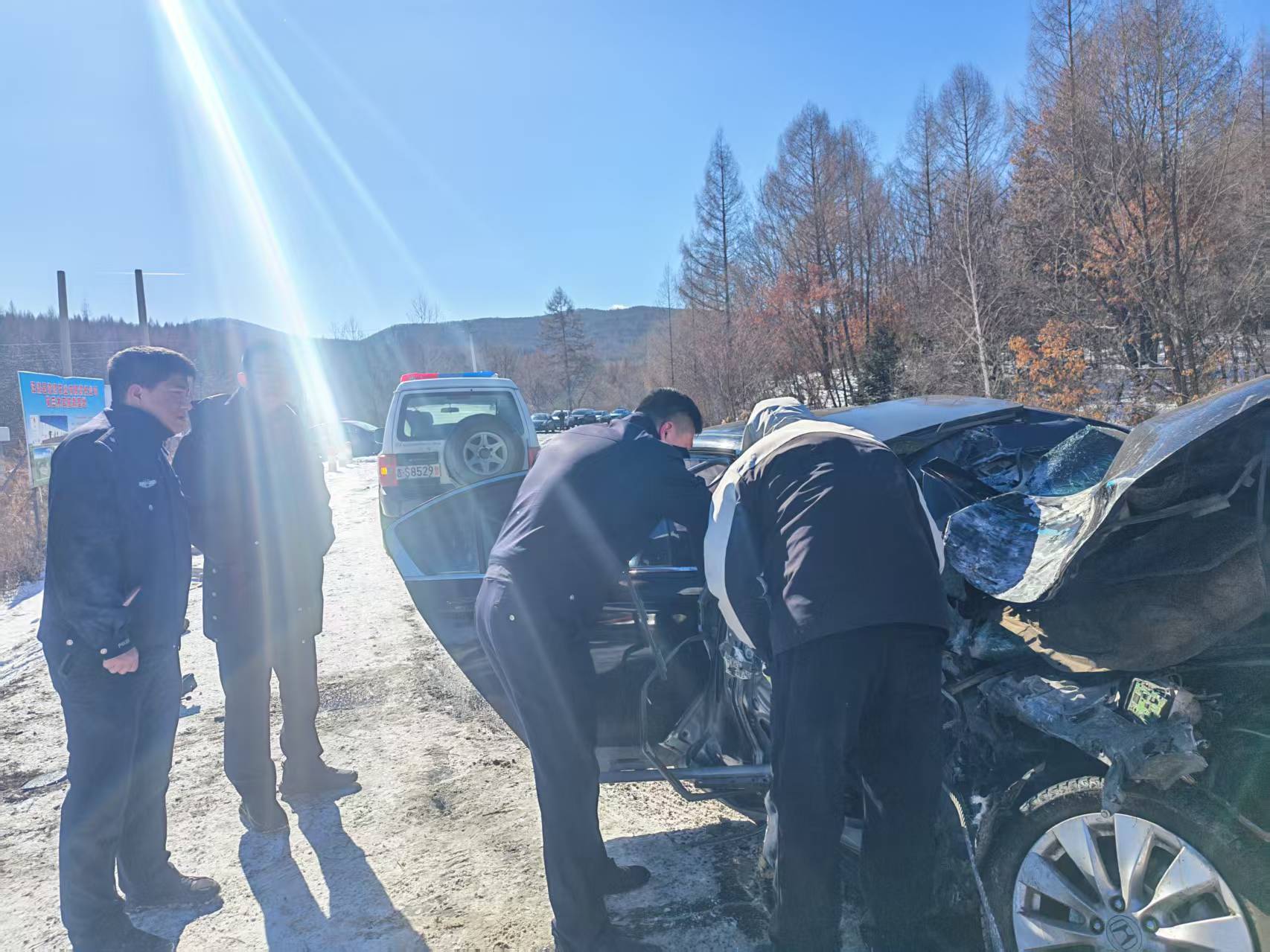 2月22日上午,青山森林派出所接到群众紧急求助,称在汪清县罗子沟镇方向路段,一辆小型汽车因路面积雪湿滑,不慎失控冲出主干道并坠入路边沟渠。事故导致车辆前部严重变形,车身A柱断裂,驾驶员被牢牢卡在驾驶座位无法动弹,生命安全受到严重威胁,急需救援。