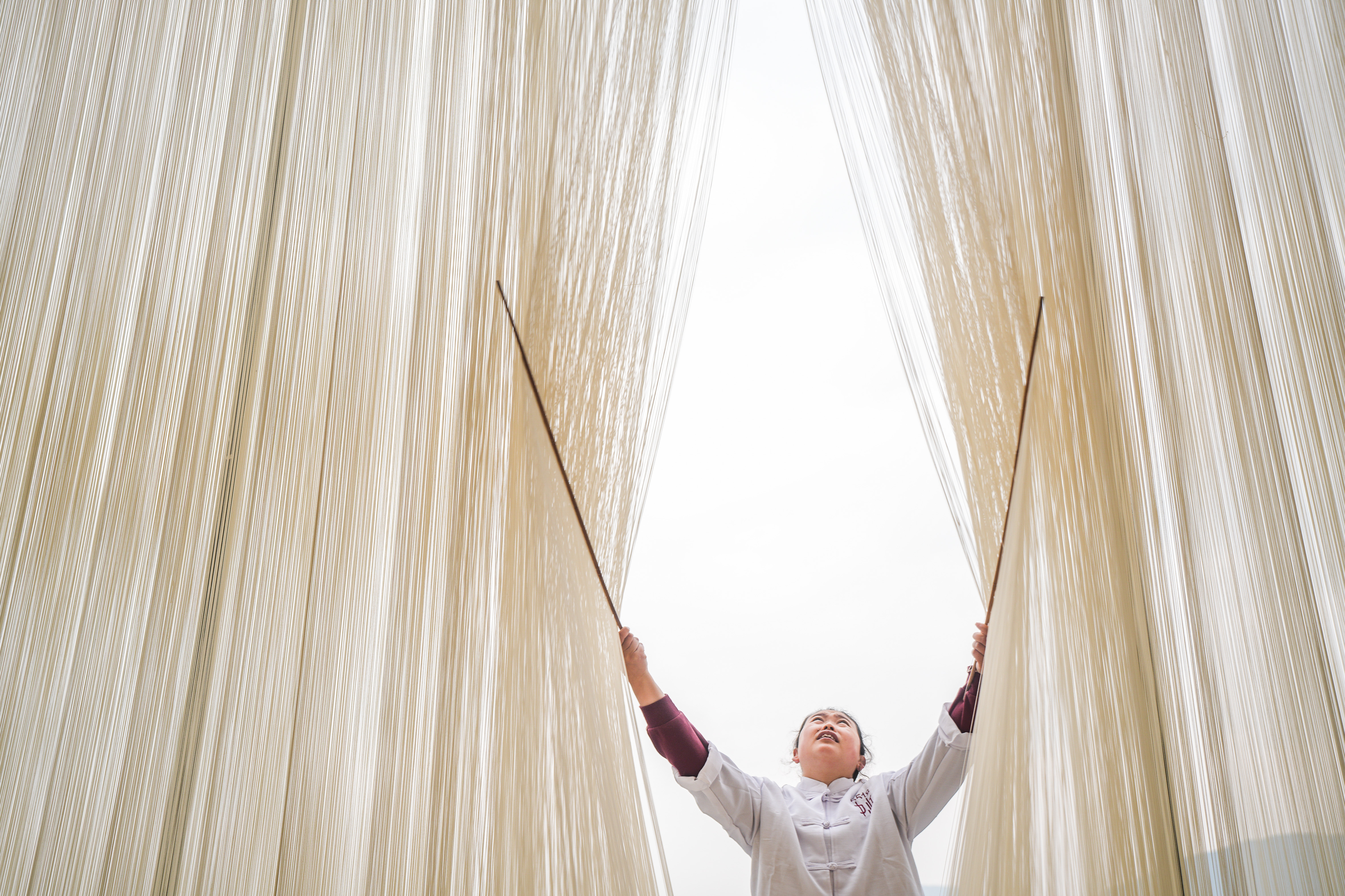 连日来,四川省德阳市中江县觉慧村村民抢抓晴好天气制作手工挂面,家家户户房前屋后晾晒的挂面如银丝垂落,非遗技艺在烟火气中活态传承。