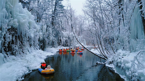 大泉河魔界漂流、水色雾凇岛漂流、九溪听泉三大核心漂流产品凭借差异化特色与高品质体验,成为安图县冰雪旅游的“流量担当”。三大景区联动发力,通过无人机航拍、生成专属短视频等智慧化服务,打造了“人在画中游”的沉浸式体验,成为游客竞相打卡的网红地标。