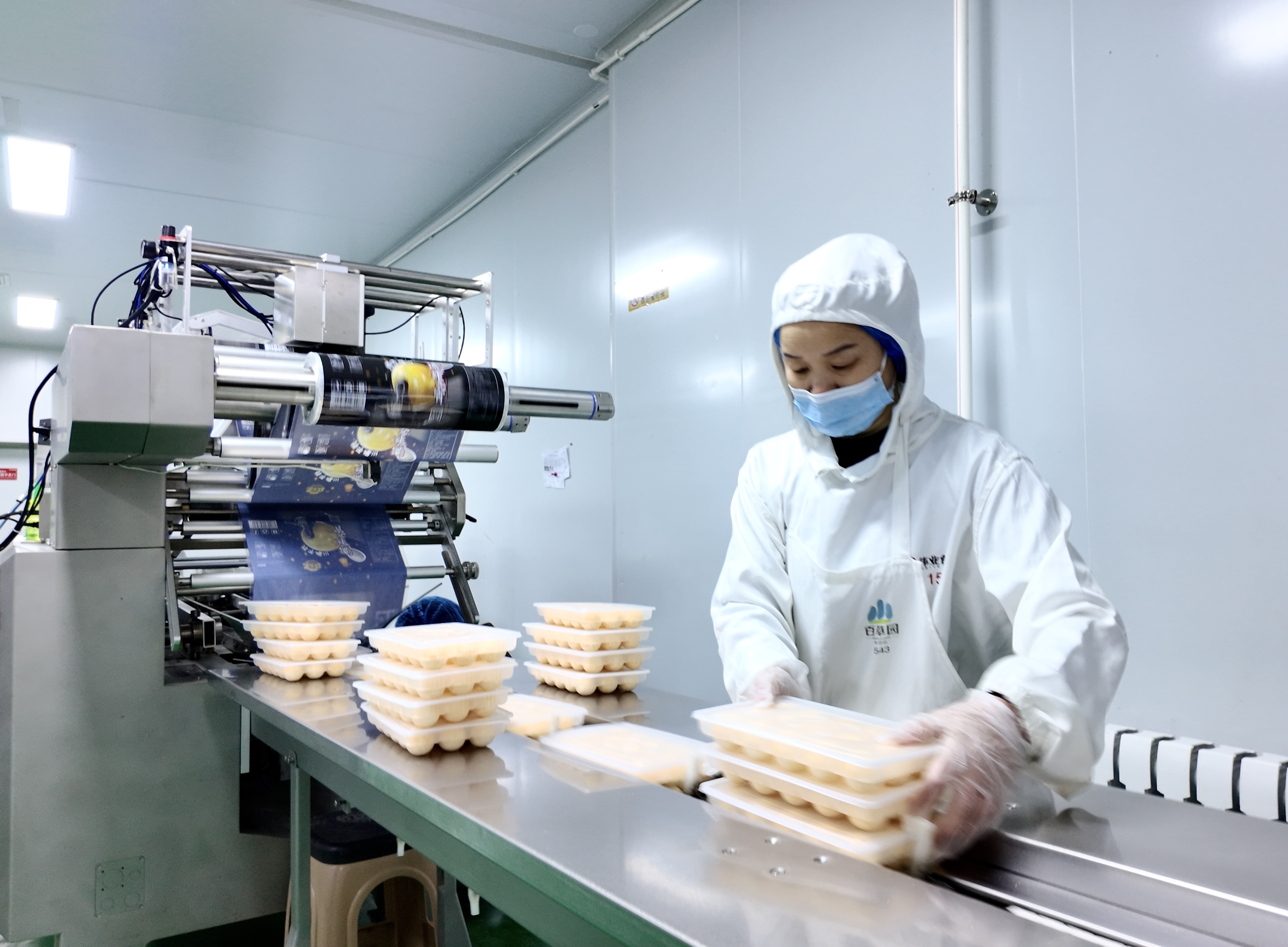 换上白色工作服、工作帽与鞋套,经过严格消毒后,记者推开一道密封门,洁净明亮的生产车间映入眼帘,流水线快速运转,工人们在岗位上忙碌着。有的专注称量馅料,保证配比;有的紧盯设备,把控成型与包装环节;有的负责分拣装箱,将成品快速码放。从和面、包馅到成型、封装,全流程机械自动化与人工精细配合。