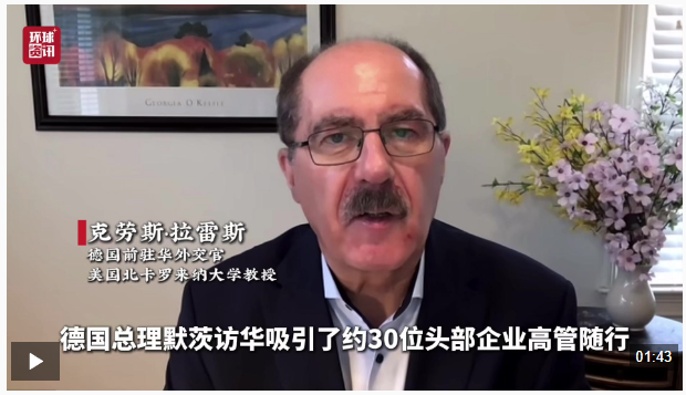 2月27日,德国前驻华外交官、目前在美国北卡罗来纳大学任教的克劳斯·拉雷斯(Klaus Larres)在接受总台环球资讯《全球洞察》栏目记者采访时表示,深化对华经济合作是默茨此访的“核心诉求”,而随同默茨访华的“企业家团组”,体现出两国经济合作“夯实基础、向新发展”的特点。