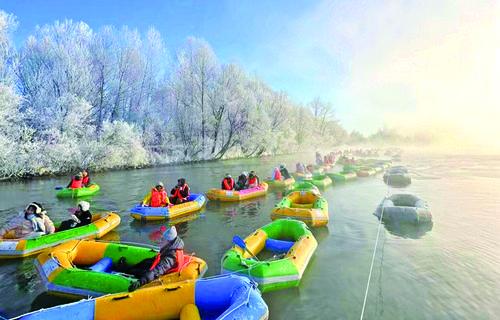 最具标志性的,是安图县首创的“矿泉水雾凇漂流”。依托河道自然走势科学规划路线,既完整保留原始河道的冰封盛景与两岸林海雪原,又通过专业安全评估与设施升级让游览更安心。累计超80万人次的游客乘舟穿行于雾凇林海之间,在如梦似幻的景致中,留下了共同的美好记忆。