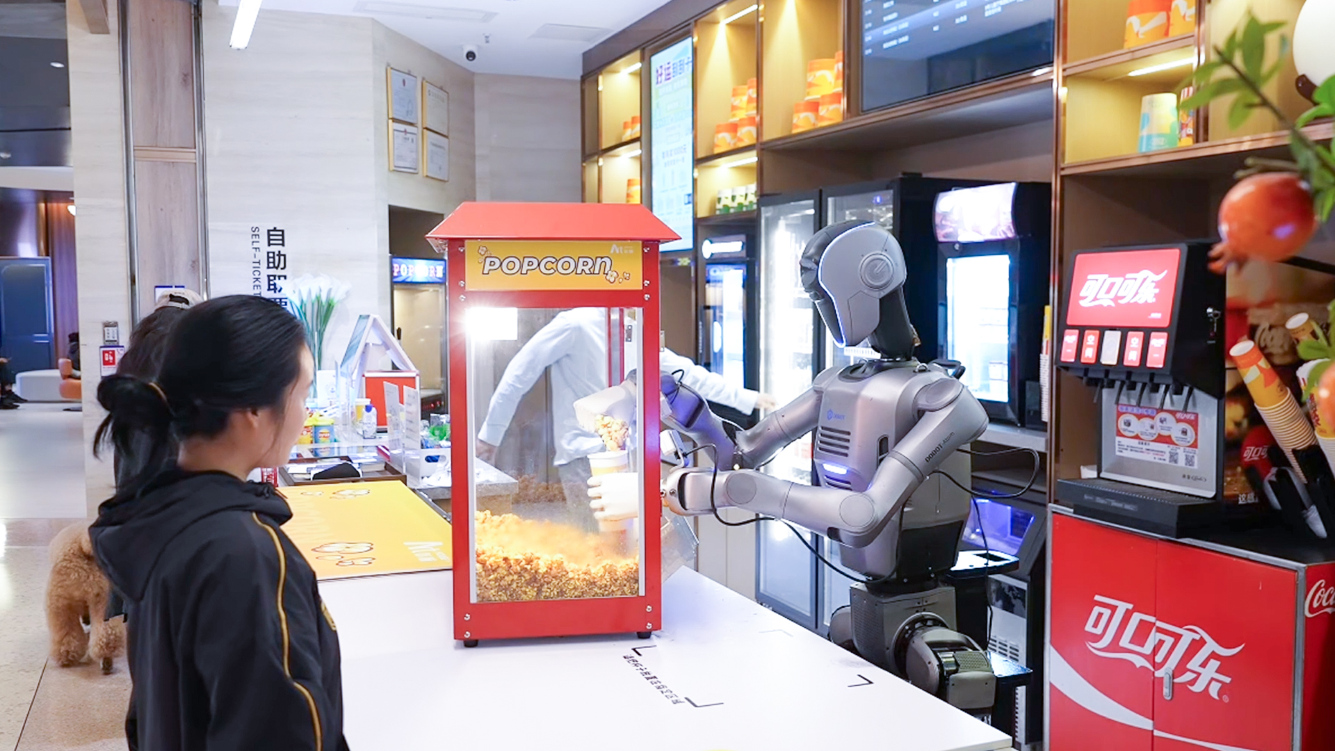 “以前我只在展会上和舞台上看到过人形机器人,没想到现在吃上了人形机器人制作的爆米花!” 接过稳稳递至面前的爆米花,带孩子观影的市民张丽丽忍不住好奇,拿起手机拍个不停。