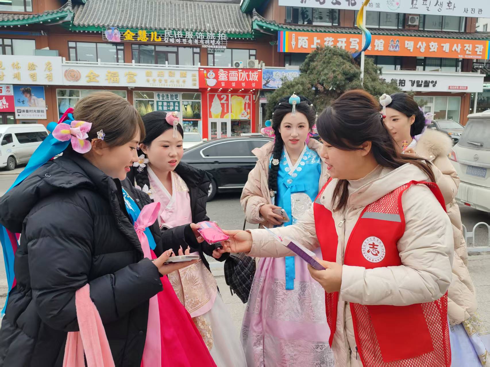 在做好基础便民服务的同时,建工街道推动志愿服务与民俗文化传播深度融合,打造特色服务品牌。组织文艺志愿者组成民俗演出队,常态化开展朝鲜族传统舞蹈、民谣演唱、四物乐演奏等文艺表演,让游客沉浸式感受民族文化魅力;在春节、元宵节、“五一”等重要节点,策划开展打糕制作、辣白菜腌制、元宵派送、民俗饰品赠送等互动体验活动,让游客在游玩中近距离体验朝鲜族传统习俗;依托“咖啡驿站”等特色阵地,开展手工艺品制作等体验项目,不断丰富游客游园体验。
