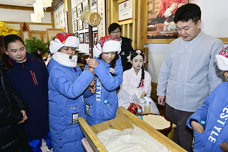 我州立足特色资源优势,精心打造了5条“冰雪+”主题研学线路,将冰雪与爱国教育、民俗文化、非遗传承、自然探秘和科学实践深度融合。在《雪守边关·贺岁爱国之旅》中,学生们站在图们口岸,抚摸界碑,真切感受“家国”二字的重量;在《瑞雪迎春・民俗年味研学之旅》中,学生们亲手制作朝鲜族美食打糕、体验传统射箭,在沉浸式的民俗互动中感悟传统文化魅力;《雪韵非遗・年俗匠心研学之旅》聚焦“非遗传承+文化浸润”,让学生在动手实践中理解传统技艺的智慧;《雪原探秘・新春林海奇观研学之旅》以“自然探秘+科学实践”为主线,让学生们深入长白山林海,通过火山地质考察、雾凇漂流与雪地徒步等方式,探究自然奇观;《雪境新春・科学探秘研学之旅》则以“科学探究+趣味实践”为核心,结合延吉恐龙博物馆的化石展览与实践体验,激发学生对生物学的兴趣。