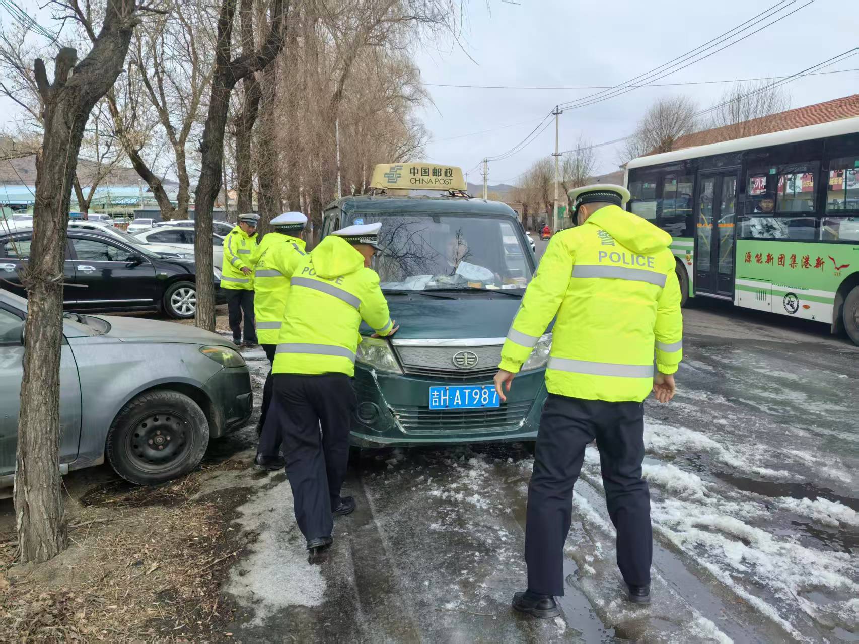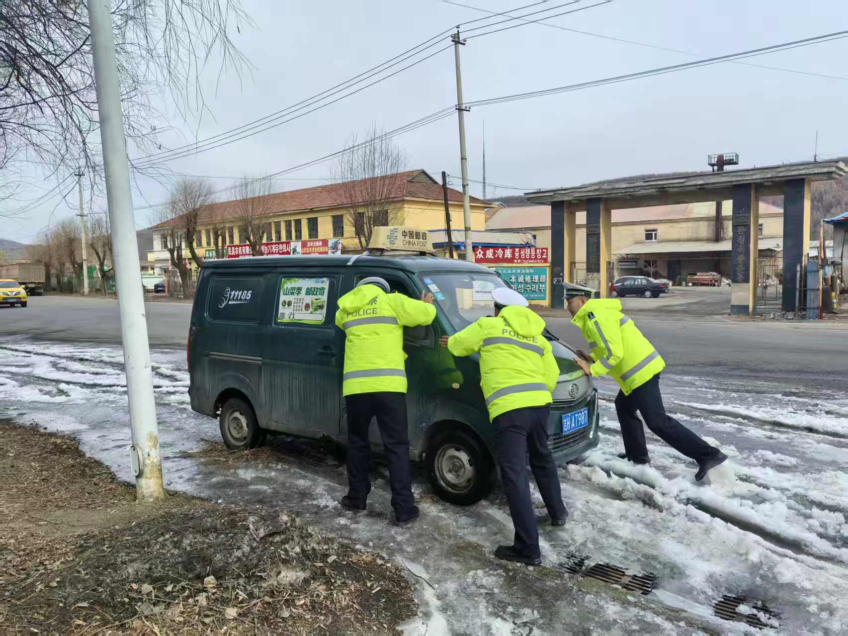 当日一辆邮政快递运输车行驶至该路段时,因冰面光滑导致车轮严重打滑,陷入冰面无法移动,驾驶员多次尝试均未能脱困,十分焦急。此时,大兴沟中队民警结束执勤返程途中发现险情,立即停车开展救援。经查看,该路段因下水井持续漏水,在低温下形成大面积结冰路面,不仅影响车辆正常通行,还极易引发交通事故。民警迅速分工行动:一人在后方设置警示标志,引导过往车辆减速避让;其余民警清理车轮周边冰块,合力推车助其脱困。经过紧张处置,被困车辆成功驶离结冰路段,恢复正常行驶。