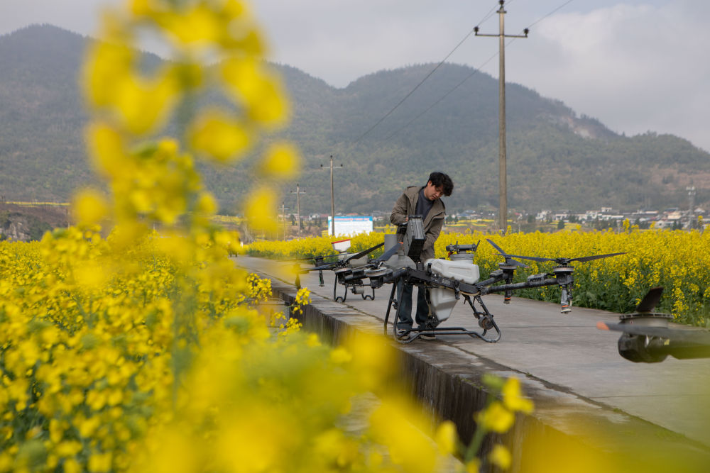 在重庆市秀山土家族苗族自治县,种植户操作3台植保无人机开展“一喷多促”田间管理作业,利用无人机搭载的高光谱和多光谱镜头,通过遥感技术为油菜生长“把脉问诊”。