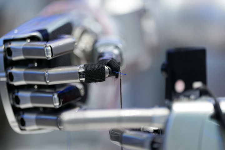 2026年3月24日,在中关村展示中心常设展上,一台配备了灵巧手的机器人在展示穿针引线。新华社记者 鞠焕宗 摄