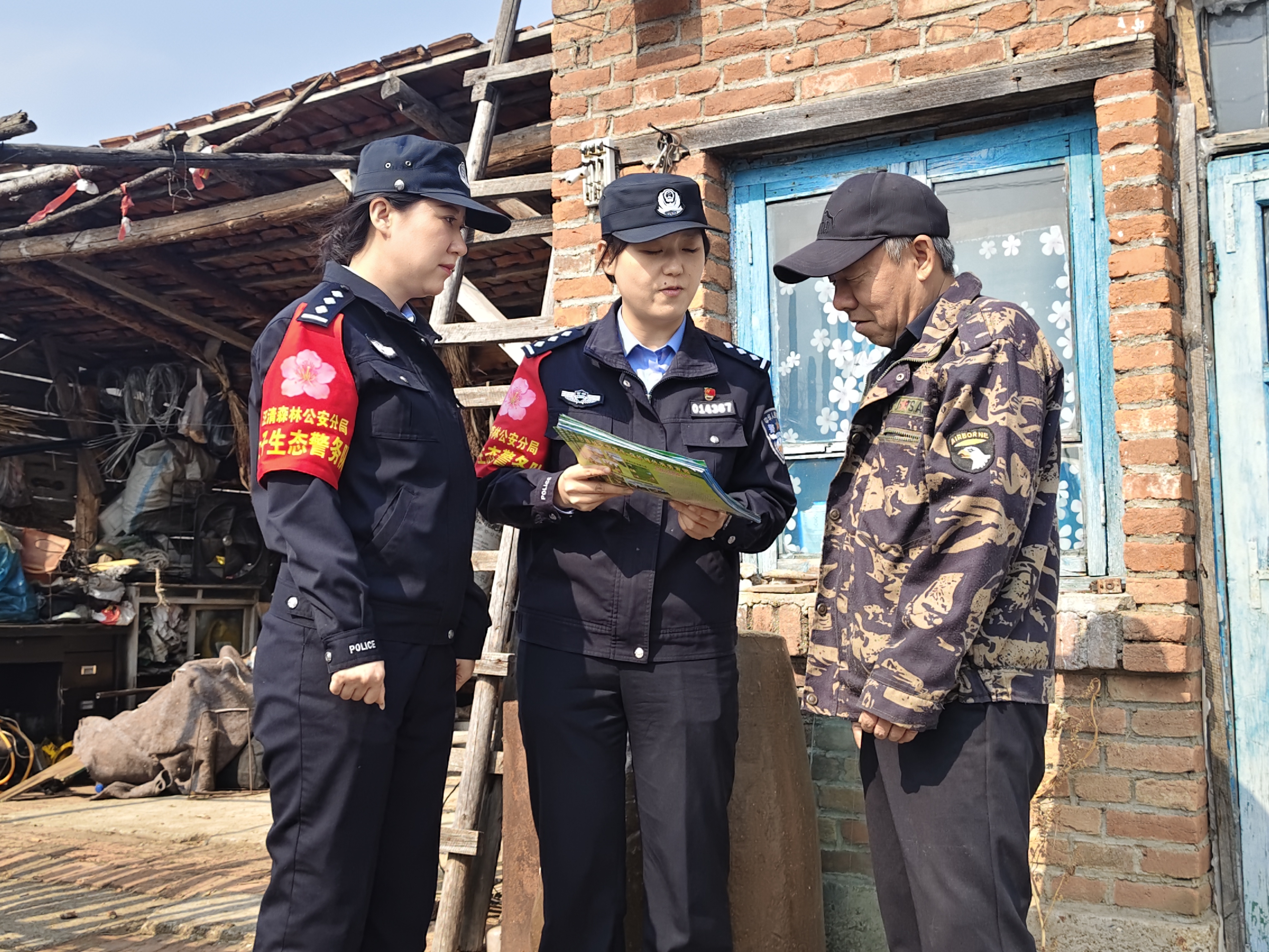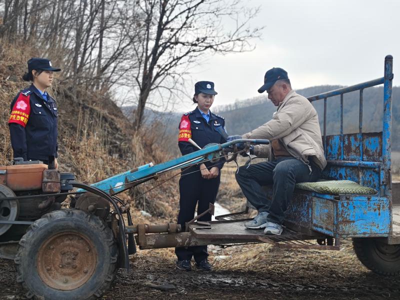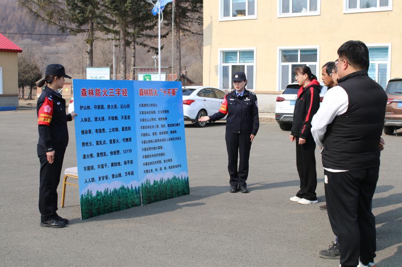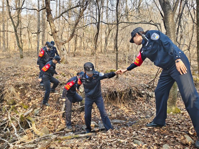3月25日8点,女警们身着整齐的制服,携带宣传资料和检查工具,踏上了宣传和排查之旅。她们首先来到林场,逐户走访住户。每到一户,队员们都耐心地向群众讲解森林防火的重要性,详细介绍引发森林火灾的常见原因、火灾的危害以及相关的法律法规。“大爷,现在是防火期,可不能在野外随便用火啊,一个火星都可能引发大火灾,后果不堪设想。”队员们亲切地与群众交流,用通俗易懂的语言提醒大家提高防火意识。在林场院内,队员们设立了宣传点,她们向群众发放森林防火宣传单,向群众讲解森林防火三字经,森林防火“十不要”,提醒他们上山不带火,带火不上山。不要在林区吸烟、丢弃火种。并手把手教群众使用防火器材,同时,深入主要道口,仔细检查过往车辆是否携带易燃物品,防止火源进入林区。一位女警对一位开四轮车的村民说:“师傅,麻烦您看一下宣传单,一定要注意森林防火,这关系到咱们大家的安全。”村民接过宣传单,点头表示会遵守规定。随后,队员们深入山林,对入林路口进行重点巡查。初春的村区,寒意依旧料峭,残雪未消与融雪交织,使得山路崎岖难行,泥泞湿滑。然而恶劣的野外环境丝毫没有削减队员们的工作热情。“这些队员大多是九零后和零零后,有的才参加工作,掌握生态这方面的知识还不是很好,但是他们善于学习,除了本职工作和讲生态以外,每天都利用业余时间学习生态知识。上手挺快。”队长何世雁说道。她们仔细检查是否有违规入林人员,是否存在野外用火迹象。在巡查过程中,女警们不放过任何一个细节,对发现的枯枝落叶等易燃物进行清理,消除潜在的火灾隐患。