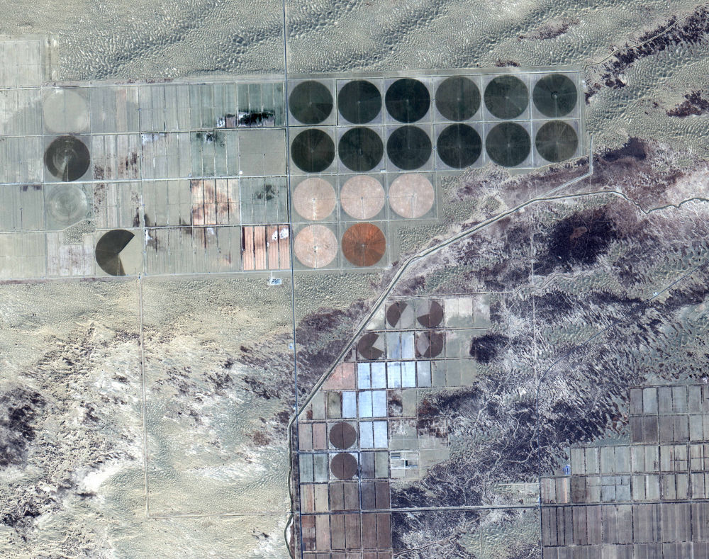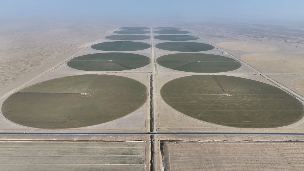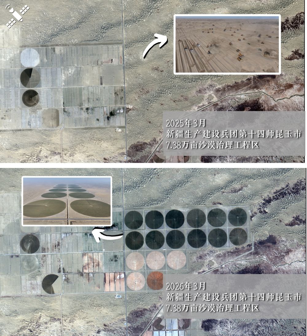 解读:对比2025年3月和2026年3月的两张卫星影像,清晰显示了一个个与沙漠形成鲜明对比的绿色“同心圆”如从天降,直观呈现“沙漠变良田”的治理奇迹。