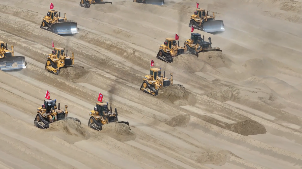推土机在沙海中轰鸣作业
