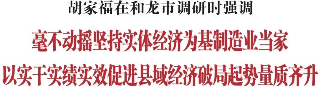 调研中,胡家福强调,和龙市要坚定不移抓好项目建设这个重中之重,把心思凝聚在项目招引上,把力气下在项目推进上,通过一个个项目落地开工、投产达效,为县域经济发展注入强劲动能。要推动项目提速建设,坚持能早则早、能快则快,加强动态分析和常态调度,加快办理可研、环评、安评等审批要件,强化资金、用工、用能等要素保障,推动签约项目快开工、在建项目快竣工、竣工项目快达效。要做大做强实体经济,坚持把发展经济的着力点放在实体经济上,立足本地资源禀赋、产业基础和比较优势,科学谋划、精准发力,布局实施一批投资规模大、支撑作用强的重大项目,集中力量做大做强制造业,为县域经济强筋壮骨、蓄势赋能。要丰富文旅产品供给,充分用好民俗、冰雪、历史、人文等资源禀赋,坚持差异化、特色化发展,精心打造文旅新场景、文旅新业态,加快推进G331环军舰山旅游集聚区、龙门湖水乐园营地综合体等重大文旅项目,推动老里克、青龙渔业等景区丰富业态、提升体验,大力发展森林康养、户外露营、田园休闲等业态,让更多游客慕名而来、流连忘返;要坚持以科技赋能文旅发展,支持景区积极引入VR、AR、全息互动投影、数字光影秀等现代信息技术手段,创新开发虚拟漫游、沉浸演艺、数字展陈等新型体验项目,开发推出一批体验感强、参与度高、趣味性足的沉浸式文旅产品,进一步激发游客的好奇心、探索欲,吸引更多游客前来打卡游玩消费。要着力提升招商质效,市委书记、市长要带着班子干、做给下属看,主动走出去、积极请进来,围绕发展壮大实体经济,密切跟踪发达地区产业转移动向和企业外迁需求,有效推介本地在成本、配套、政策等方面的比较优势,实打实地招引一批制造业项目布局落子、安家落户。